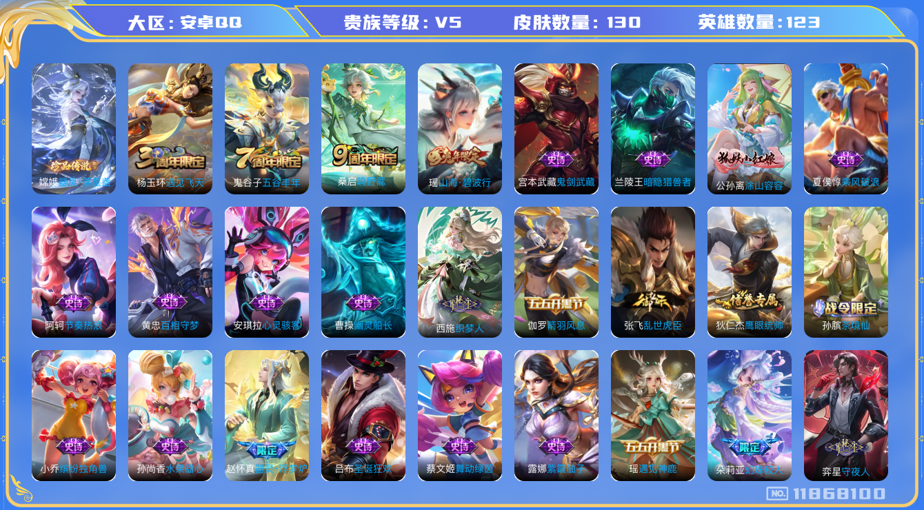 [11868100]V5 1珍品传说 1传说 123英雄 130皮肤 可修改实名 优质装备:器灵·落星盏,涂山容容 珍宝阁皮:万物之道 限定皮:鸣野蒿,山海·碧波行(瑶年限),遇见飞天,五谷丰年 史诗皮:鸭鸭历险记-刘禅,器灵·浮梦炉,龙之律动,百相守梦-周瑜,茶境仙,幻珠鲛人,百相守梦-黄忠,织梦人,守夜人,遇见神鹿,紫霞仙子,乱世虎臣,节奏热浪,女仆咖啡,水果甜心,心灵骇客,暗隐猎兽者,幽灵船长,鬼剑武藏,舞动绿茵,缤纷独角兽,乘风破浪,箭羽风息,圣诞狂欢,鹰眼统帅