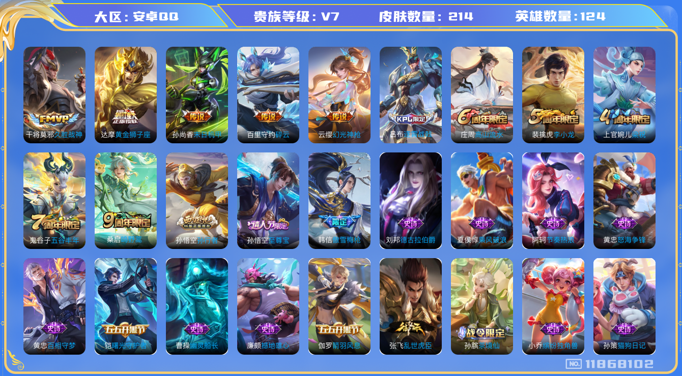 [11868102]V7 6传说 124英雄 214皮肤 可修改实名 优质装备:黄金狮子座,久胜战神,末日机甲-孙尚香(绿蚂蚱),碎云,涂山容容 传说皮:幻光神枪 珍宝阁皮:蔷薇恋人,玩趣恶龙 限定皮:逐霄战戟,鸣野蒿,至尊宝,傲雪梅枪,高山流水,五谷丰年,梁祝,李小龙,孙行者 史诗皮:星界战将,龙之律动,茶境仙,怒海争锋,撼地雄心,破空之剑,蔬乡物语(鲁班七号),百相守梦-百里守约,百相守梦-黄忠,紫霞仙子,特工魅影,千年之狐,江河有灵,冰冠公主,偶像歌手,电玩·爆裂旋风,末日机甲-吕布,猫狗日记-孙策,乱世虎臣,节奏热浪,修罗,摇滚巨星,水果甜心,绅士熊喵,天才门将,星夜王子,功夫厨神,德古拉伯爵,暗隐猎兽者,幽灵船长,鬼剑武藏,心灵战警,纤云弄巧,缤纷独角兽,乘风破浪,逐浪之夏,水晶猎龙者,曙光守护者,箭羽风息,金属风暴,圣诞狂欢,圣诞恋歌,鹰眼统帅,黎明之约,无心,未来纪元-赵云