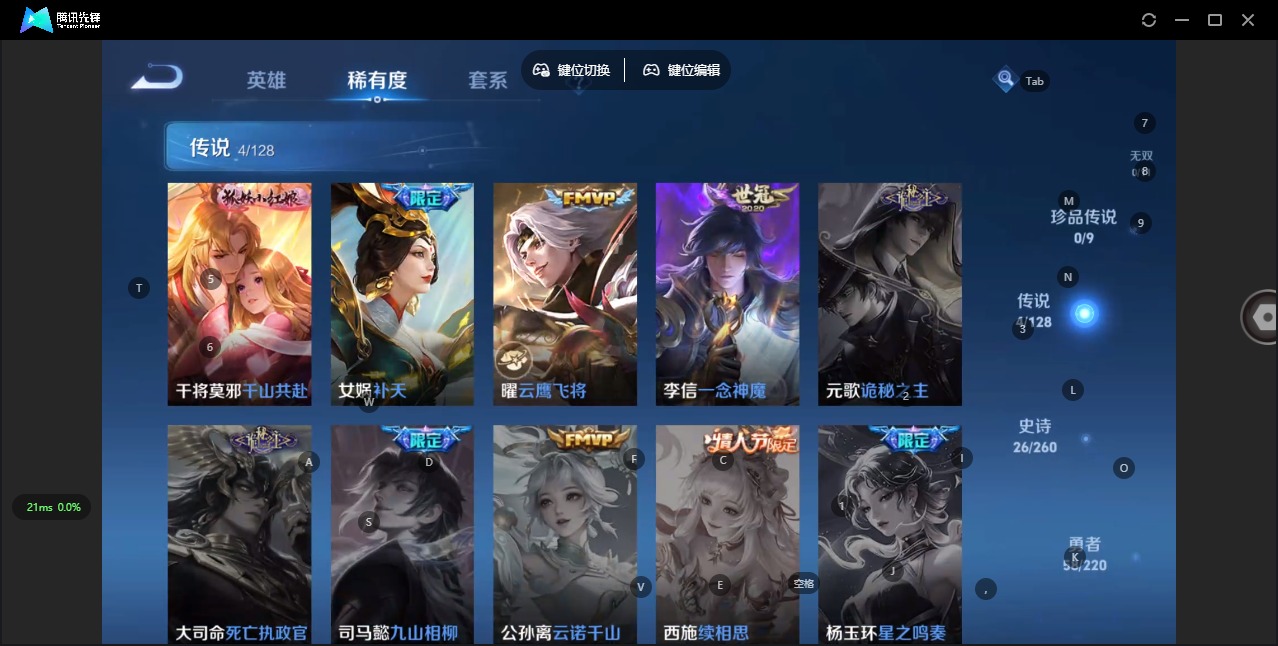 - PX_2096228-87 安卓QQ/无双王者/367皮肤/125英雄/3典藏/0珍品无双/2无双/2珍品传说/30传说/111史诗/9稀有英雄 【2 珍品传说】朽木白哉 暃,时之奇旅 孙策, 【3 典藏皮肤】鸣剑·曳影 李白,弑枪猎影 韩信,九霄神辉 花木兰, 【2 无双皮肤】群星魔术团 韩信,器灵·螭龙剑 曜, 【30 传说皮肤】启明星使 虞姬,逐花归海 澜,无双飞将 马超,李逍遥 曜,云鹰