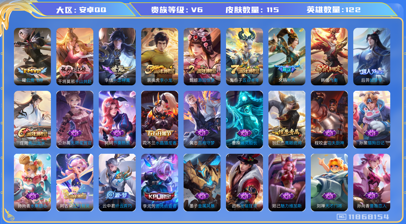 [11868154]V6 4传说 122英雄 115皮肤 可修改实名 优质装备:云鹰飞将(小将军),一念神魔,千山共赴 珍宝阁皮:蔷薇恋人 限定皮:补天,飞衡(韩信年限),高山流水,五谷丰年,游园惊梦,李小龙,如梦令-后羿 史诗皮:百相守梦-黄忠,江河有灵,匿光侦查者,无限星赏官,猫狗日记-孙策,节奏热浪,水果甜心,天才门将,功夫厨神,幽灵船长,纤云弄巧,水晶猎龙者,金属风暴,圣诞狂欢,鹰眼统帅,魅力维加斯