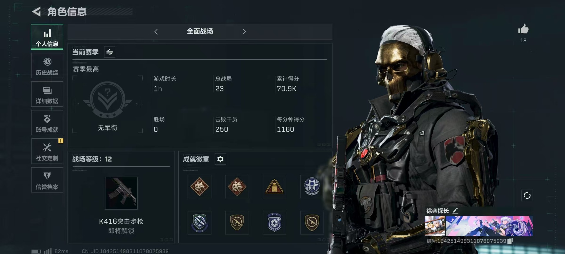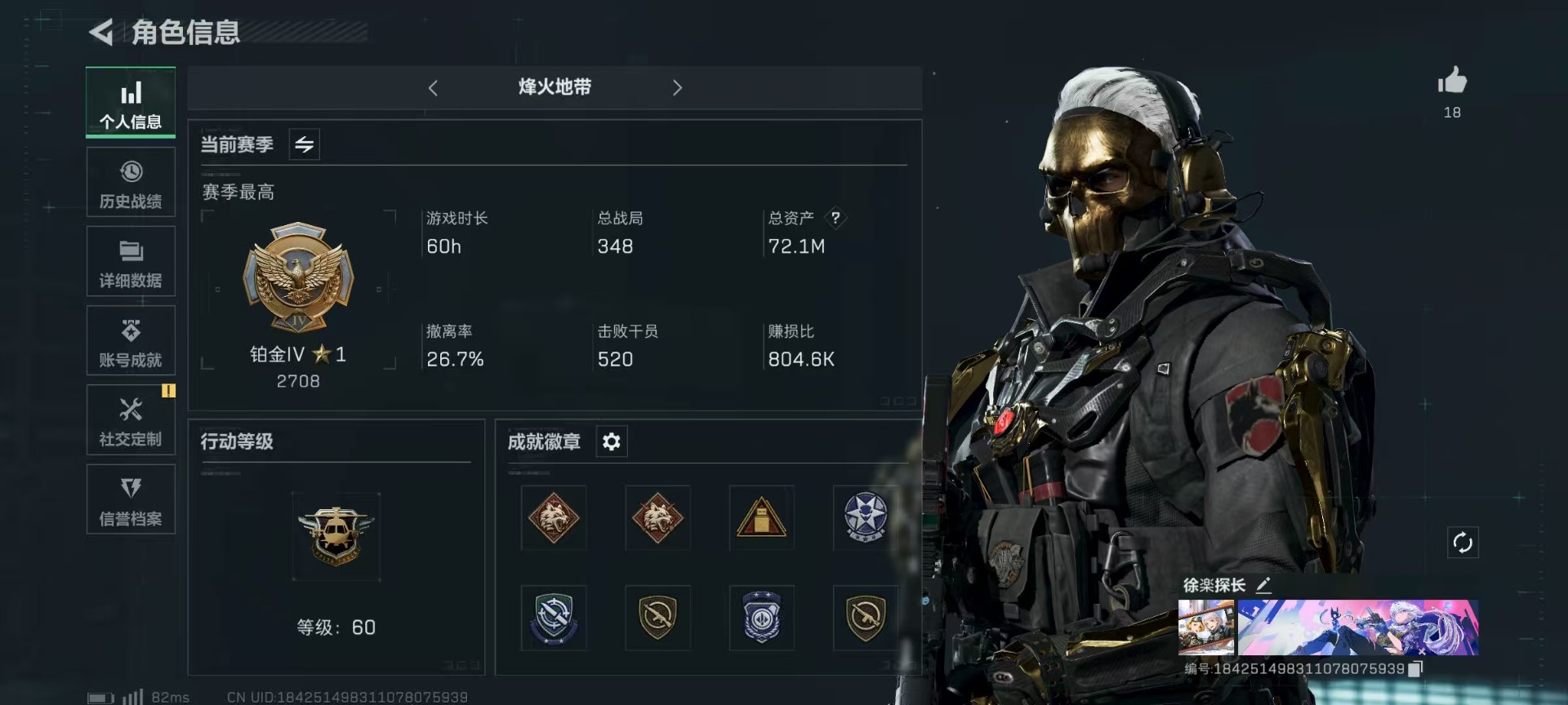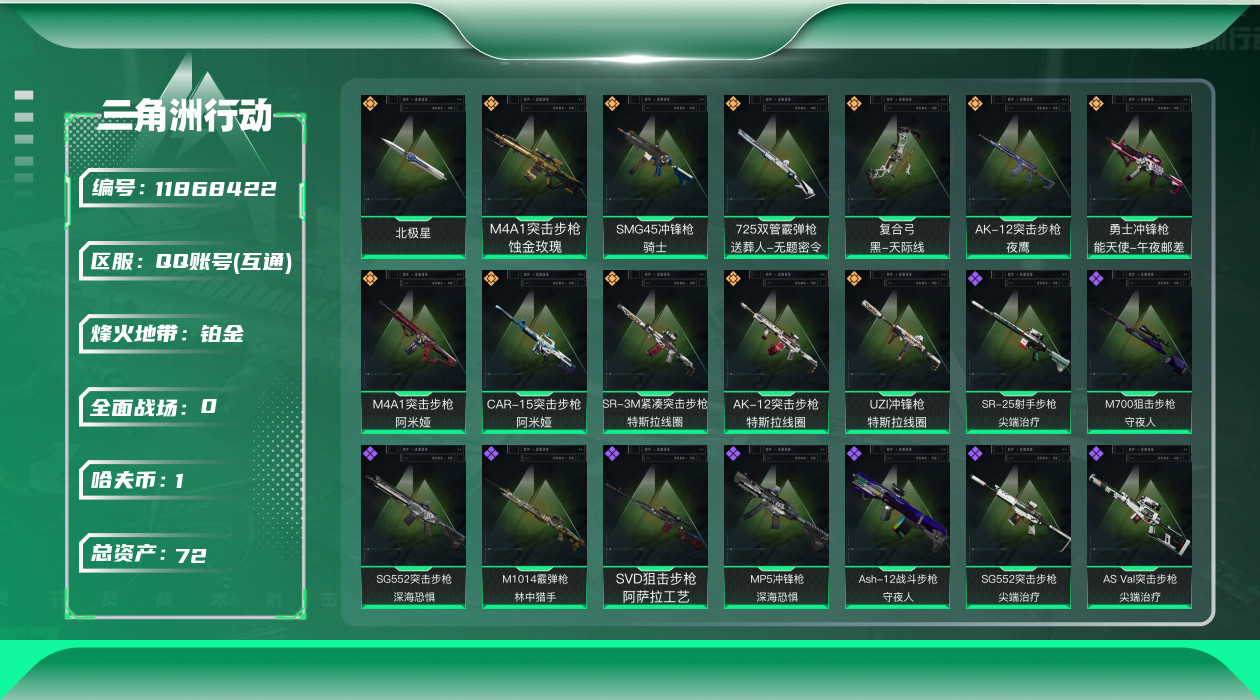 [11868422]总资产:72.1M 1近战传说 12传说枪械 哈夫币:1.271K 可二次 可修改实名 优质装备:近战-北极星 烽火地带段位:铂金 全面战场段位:无段位 传说武器皮肤:AK-12突击步枪-特斯拉线圈,SR-3M紧凑突击步枪-特斯拉线圈,UZI冲锋枪-特斯拉线圈,勇士冲锋枪-能天使-午夜邮差,725双管霰弹枪-送葬人-无题密令,M4A1突击步枪-阿米娅,CAR-15突击步枪-阿米娅,复合弓-黑-天际线,SMG45冲锋枪-骑士,M4A1突击步枪-蚀金玫瑰,AK-12突击步枪-夜鹰 史诗武器皮肤:PKM通用机枪-蝮蛇,SVD狙击步枪-荒野求生,SR-3M紧凑突击步枪-荒野求生,PKM通用机枪-守夜人,M1014霰弹枪-林中猎手,PSG-1射手步枪-无垢,MP7冲锋枪-无垢,腾龙突击步枪-无垢,SV-98狙击步枪-林中猎手,PTR-32突击步枪-英雄,M250通用机枪-囚徒,PKM通用机枪-荒野求生,M700狙击步枪-守夜人,AS Val突击步枪-尖端治疗,SG552突击步枪-尖端治疗,S12K霰弹枪-曙光,SVD狙击步枪-阿萨拉工艺,Ash-12战斗步枪-守夜人,SR-25射手步枪-尖端治疗,MP5冲锋枪-深海恐惧,勇士冲锋枪-深海恐惧,SG552突击步枪-深海恐惧