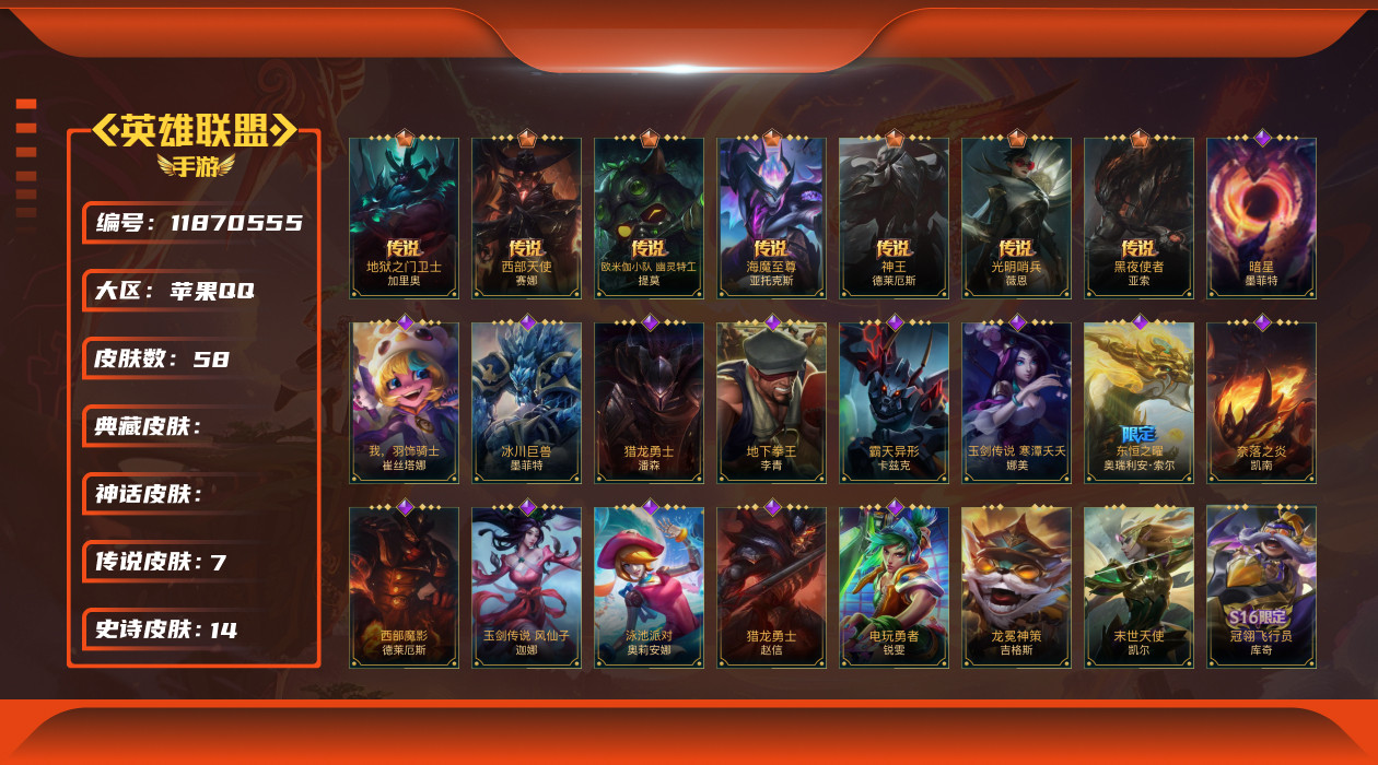 [11870555]7传说 14史诗 58皮肤 可二次 可修改实名 优质装备:光明哨兵薇恩,黑夜使者亚索,欧米伽小队 幽灵特工,神王诺手,西部天使赛娜 段位:翡翠 传说皮:海魔至尊 亚托克斯,地狱之门卫士 亮点:光明哨兵薇恩,黑夜使者亚索,欧米伽小队 幽灵特工,神王诺手,西部天使赛娜