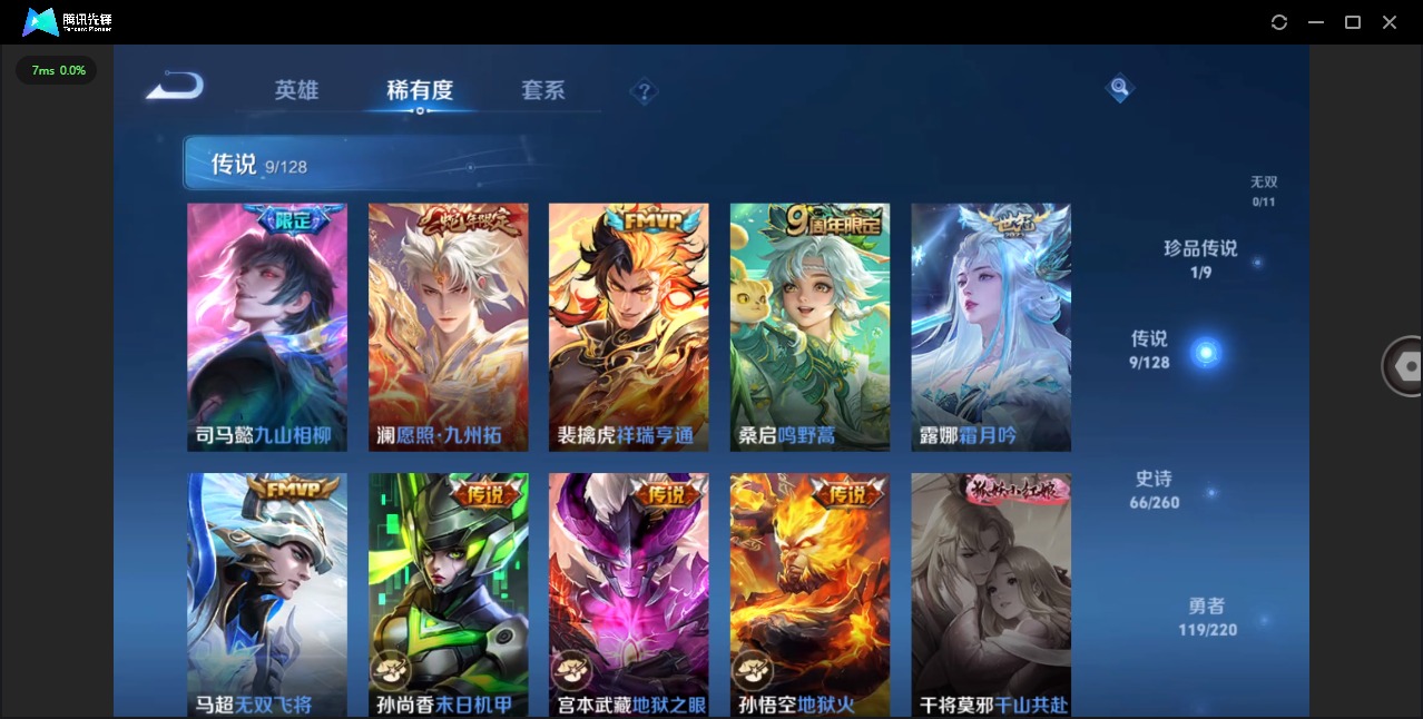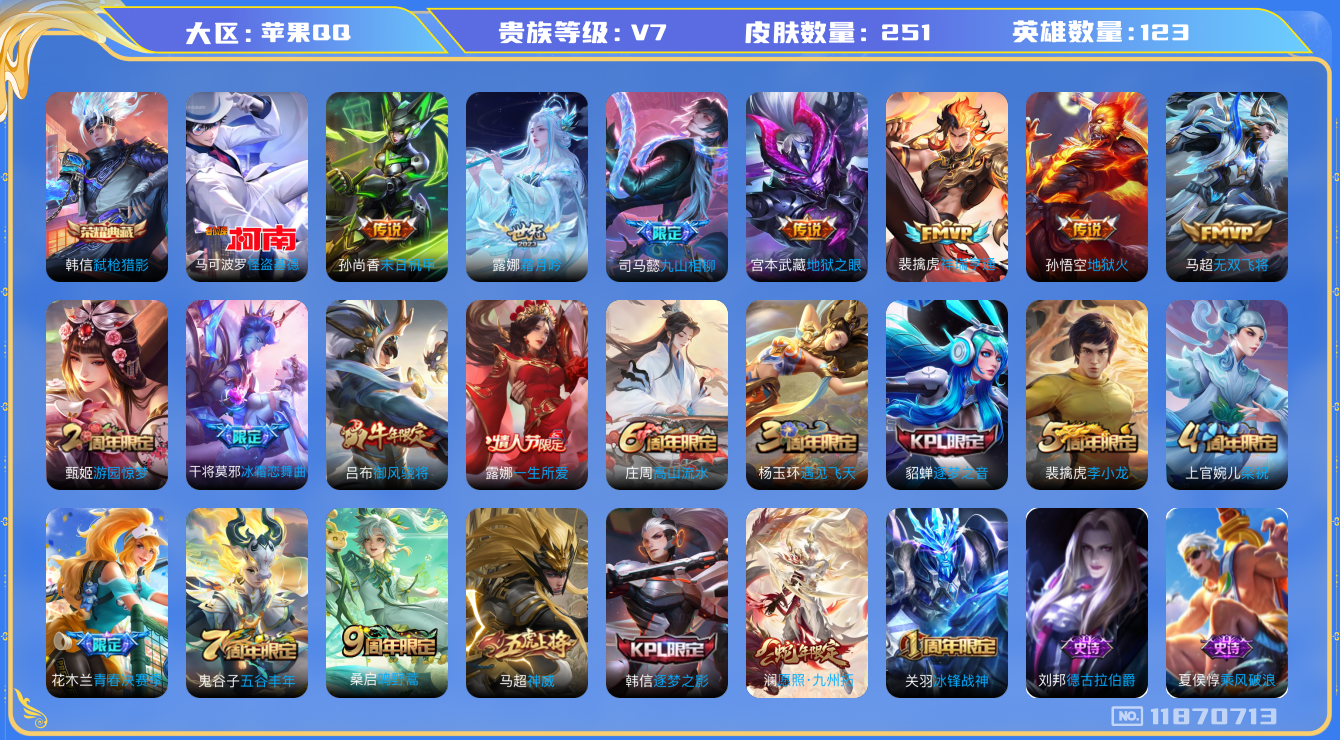 [11870713]V7 1典藏 1珍品传说 9传说 123英雄 251皮肤 可修改实名 优质装备:弑枪猎影(韩信典藏),怪盗基德,末日机甲-孙尚香(绿蚂蚱),地狱火,地狱之眼,无双飞将,霜月吟,涂山容容 传说皮:九山相柳,祥瑞亨通 珍宝阁皮:万物之道,女武神 限定皮:愿照·九州拓(澜年限),鸣野蒿,神威(电光马子),遇见飞天,高山流水,五谷丰年,冰锋战神,游园惊梦,梁祝,御风骁将(吕布年限),逐梦之音,李小龙,逐梦之影,一生所爱,青春决赛季,冰霜恋舞曲 史诗皮:化蝶舞,星界战将,谪仙醉月,百相守梦-百里守约,星界特工,百相守梦-黄忠,织梦人,紫霞仙子,电玩小子(小书包),黄金分割率,特工魅影,江河有灵,冰冠公主,偶像歌手,晚萤,猫狗日记-孙策,乱世虎臣,节奏热浪,修罗,女仆咖啡,摇滚巨星,水果甜心,星夜王子,功夫厨神,德古拉伯爵,暗隐猎兽者,幽灵船长,鬼剑武藏,缤纷独角兽,乘风破浪,逐浪之夏,水晶猎龙者,金属风暴,原初追逐者,圣诞恋歌,鹰眼统帅,暗夜贵公子,黎明之约,奇遇舞章,未来纪元-赵云