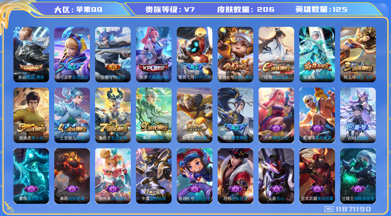 - [11626616]V7 1典藏 5传说 124英雄 248皮肤 可修改实名 优质装备:全息碎影(猴子典藏),黄金狮子座,炽阳神光,一念神魔,超时空战士-狄仁杰,山海·炽霜斩(李信年限) 珍宝阁皮:万物之道,蔷薇恋人,玩趣恶龙 限定皮:傲雪梅枪,遇见飞天,高山流水,五谷丰年,梁祝,御风骁将(吕布年限),李小龙,逐梦之影,孙行者,猪悟能,大圣娶亲 史诗皮:百相守梦-黄忠,黄金分割率,特工魅影,江河有灵,雪夜绮愿(周瑜),百解令(蒙犽),暗夜猫娘,末日机甲-吕布,乱世虎臣,节奏热浪,修罗,水果甜心,天才门将,星夜王子,暗隐猎兽者,鬼剑武藏,纤云弄巧,繁星吟游(呼啦呼啦),拒霜思,乘风破浪,水晶猎龙者,曙光守护者,热力回旋,金属风暴,魅力维加斯,赏金猎手,无心,未来纪元-赵云