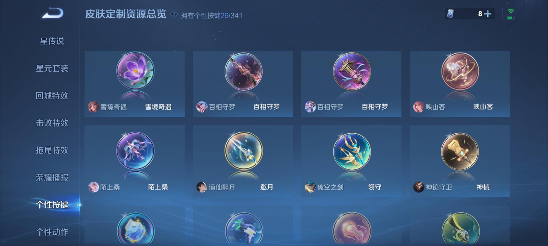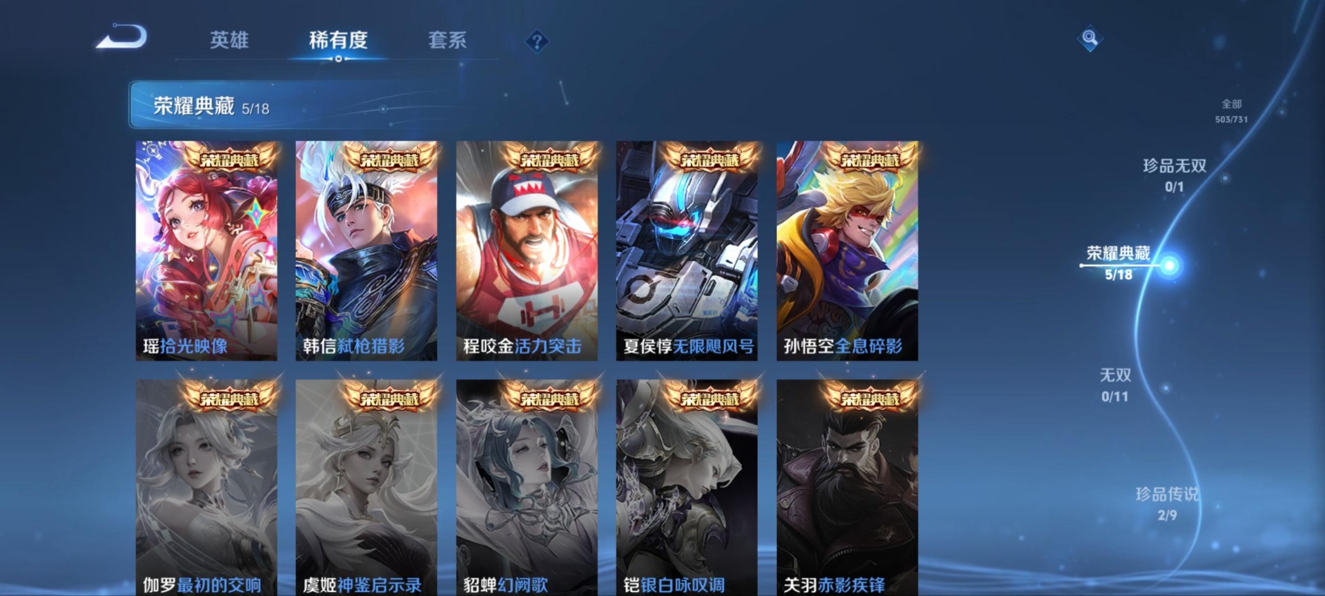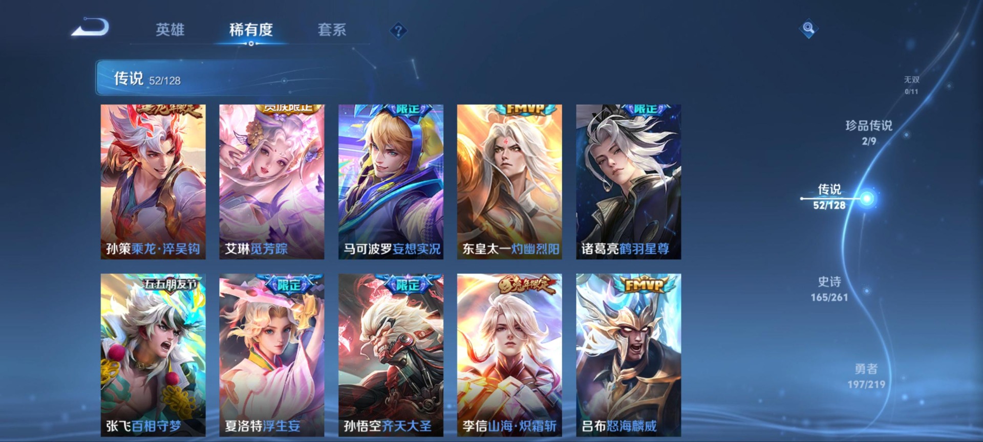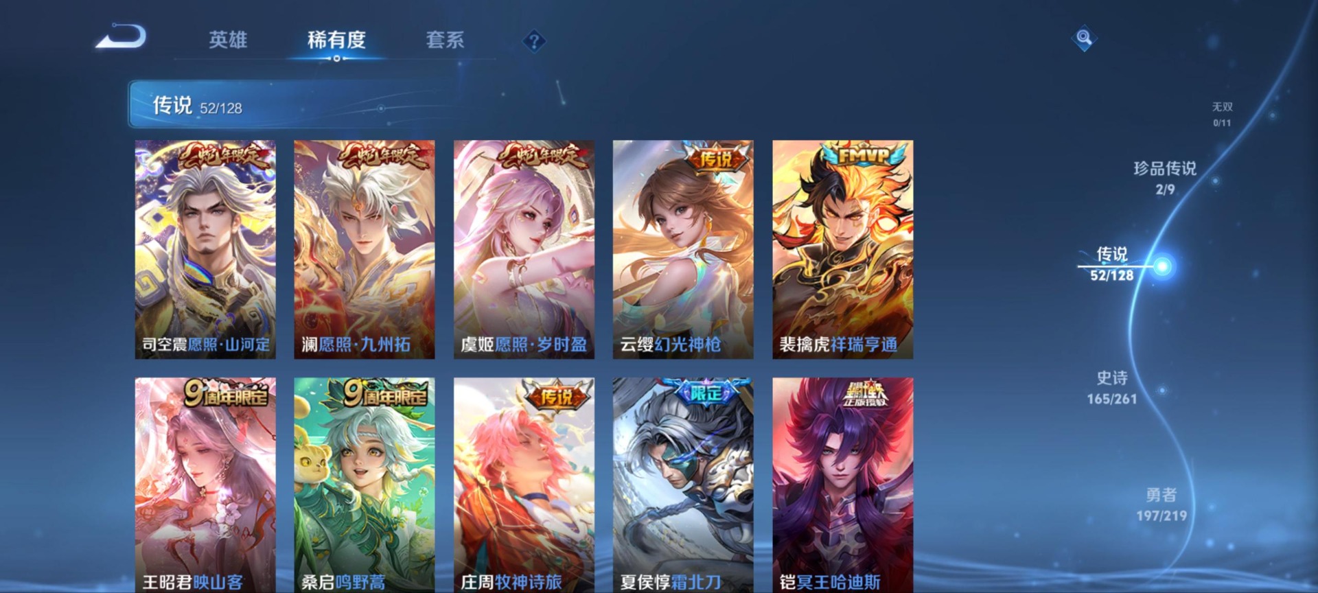 金蝉唐三藏,夏侯惇匿光决锋者,夏侯惇霜北刀,黄忠烈魂,甄姬女儿国国王,盾山梦圆繁星,廉颇寅虎·御盾,伽罗天狼溯光者,伽罗太华,小乔纯白花嫁,典韦岱宗,后羿无尽星芒,吕布御风骁将,镜匿光追影者,庄周云端筑梦师,周瑜真爱至上,公孙离玉兔公主,司空震愿照·山河定,鲁班大师匿光启智者,裴擒虎李小龙,裴擒虎天狼狩猎者,上官婉儿梁祝,安琪拉魔法小厨娘,马可波罗山海·玄木吟,艾琳陌上桑,桑启鸣野蒿,猪八戒猪悟能,孙悟空孙行者,孙悟空至尊宝,孙悟空美猴王,雅典娜神奇女侠,赵云引擎之心,云中君时之祈愿,妲己时之彼端,妲己时之奇旅,韩信傲雪梅枪,韩信飞衡,瑶时之祈愿,澜愿照·九州拓,虞姬愿照·岁时盈,妲己热情桑巴,王昭君凤凰于飞,王昭君星穹之声,王昭君映山客