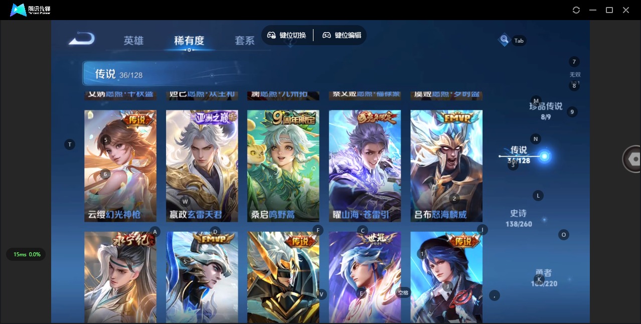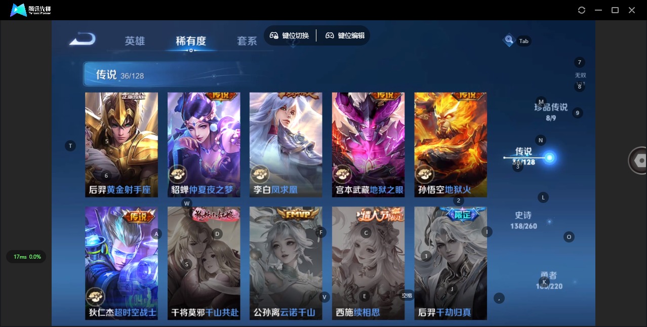 - PX_2081919-贵族等级: V6 英雄数: 122 皮肤数: 190 传说皮: 淬星耀世,灼幽烈阳,琥珀纪元铠 限定皮: 遇见飞天,李小龙,奔雷神使,梁祝,高山流水,猪悟能,五谷丰年