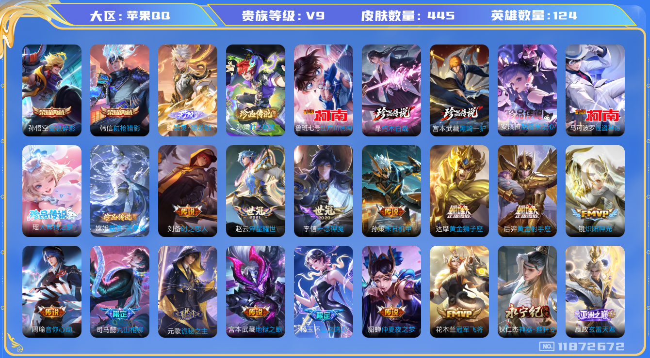 [11872672]V9 2典藏 1无双 8珍品传说 36传说 124英雄 445皮肤 可修改实名 优质装备:全息碎影(猴子典藏),弑枪猎影(韩信典藏),器灵·螭龙剑,江户川柯南,怪盗基德,器灵·落星盏,酷洛米之心,大耳狗之梦,朽木白哉,黑崎一护,黄金狮子座,黄金射手座,冠军飞将,黄金白羊座,炽阳神光,一念神魔,地狱火,仲夏夜之梦(大飞蛾),零号·赤焰,地狱之眼,音你心动-周瑜,胖达荣荣,时之恋人-刘备(电焊工),淬星耀世,超时空战士-狄仁杰,末日机甲-孙策,无双飞将,神器·狴犴令,山海·苍雷引(电光曜子),玄雷天君,诡秘之主,涂山容容 珍品传说:时之奇旅-孙策 传说皮:死亡执政官,九山相柳,星之鸣奏,幻光神枪 珍宝阁皮:万物之道,女武神,玩趣恶龙 限定皮:愿照·九州拓(澜年限),愿照·福禄聚(蔡文姬年限),愿照·岁时盈(虞姬年限),愿照·山河定(司空震年限),愿照·众生和(妲己年限),愿照·千秋盛(女娲年限),逐霄战戟,陌上桑,鸣野蒿,至尊宝,凤求凰(白切鸡),傲雪梅枪,白晶晶,时雨天司(水龙头),神威(电光马子),飞衡(韩信年限),高山流水,怒海麟威,五谷丰年,天狼狩猎者,逐梦之星,岱宗(典韦年限),奔雷神使(牛魔年限),天狼绘梦者,李小龙,如梦令-后羿,孙行者,猪悟能,大圣娶亲,青春决赛季,云端筑梦师,寅虎·御盾(廉颇年限),时之祈愿-云中君,百木心枪,山海·玄木吟(马可年限),冰霜神祇 史诗皮:赞萌露比,鸭鸭历险记-刘禅,飞车小橘子,苍鳞隐世,器灵·浮梦炉,糖绘人间,狼魂孤将,化蝶舞,灵蛊蚀心,星界战将,龙之律动,雪豹·霜爪,藏狐·褐绒,石田雨龙,百相守梦-周瑜,茶境仙,幻珠鲛人,破空之剑,百相守梦-百里守约,百相守梦-黄忠,织梦人,守夜人,紫霞仙子,苍穹之光,电玩小子(小书包),黄金分割率,特工魅影,千年之狐,永昼,江河有灵,魅语,高渐离燃音魔法,蒙恬荣光圣徽,无限星赏官,冰冠公主,青蛇,偶像歌手,白蛇,晚萤,电玩·爆裂旋风,百相守梦(刘备),暗夜猫娘,末日机甲-吕布,猫狗日记-孙策,猫狗日记-大乔,时之恋人-孙尚香,乱世虎臣,节奏热浪,修罗,女仆咖啡,摇滚巨星,水果甜心,绅士熊喵,天才门将,星夜王子,心灵骇客,时之奇旅-安琪拉,功夫厨神,德古拉伯爵,暗隐猎兽者,幽灵船长,鬼剑武藏,暗渊魔法,心灵战警,乐园奇幻夜,天秀·启明,舞动绿茵,地狱岩魂,纤云弄巧,繁星吟游(呼啦呼