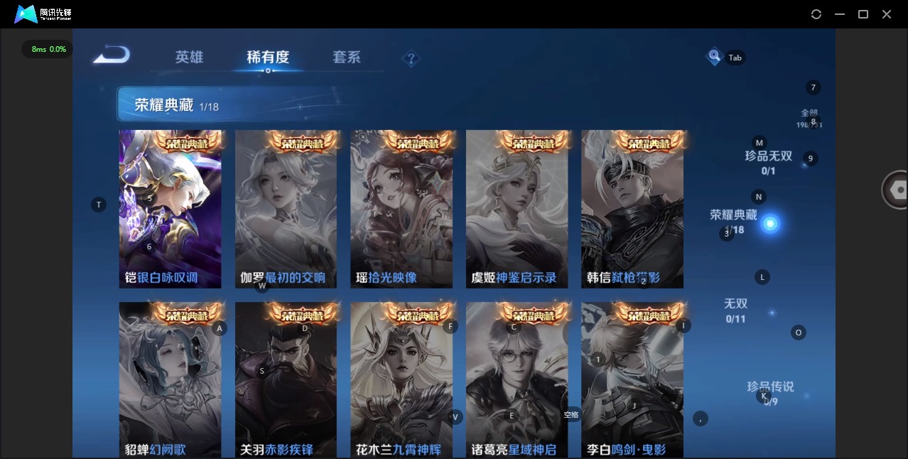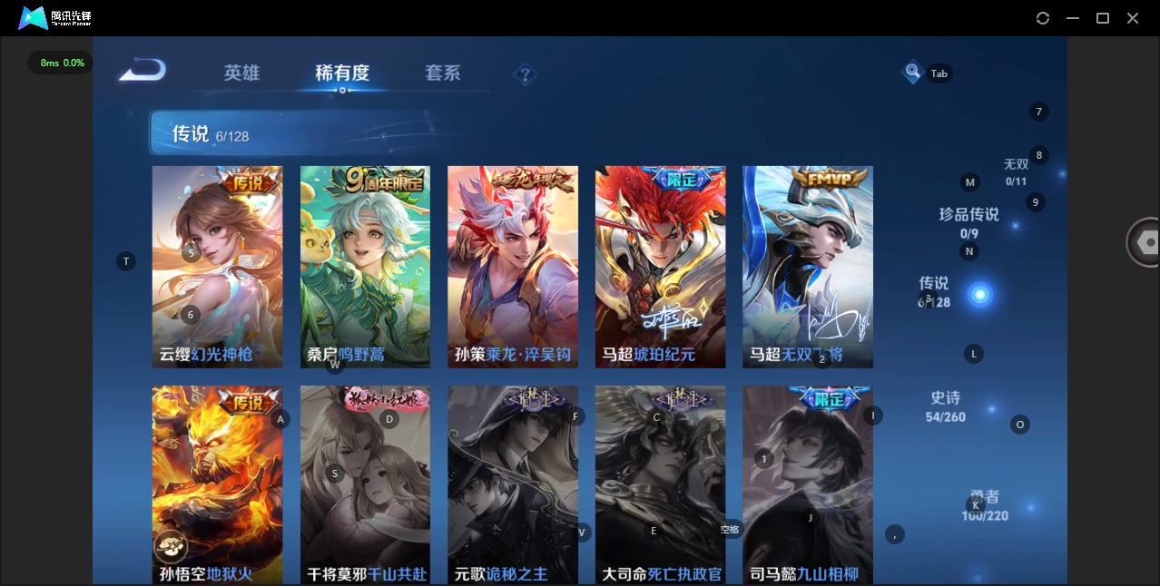 - [11884283]V8 1典藏 10传说 126英雄 340皮肤 典藏英雄武则天 可修改实名 优质装备:鸣剑·曳影,云鹰飞将(小将军),末日机甲-孙尚香(绿蚂蚱),地狱火,地狱之眼,胖达荣荣 传说皮:九山相柳,幻光神枪 珍宝阁皮:妄想食味,优雅恋人,蔷薇恋人 限定皮:愿照·九州拓(澜年限),逐霄战戟,鸣野蒿,至尊宝,遇见飞天,高山流水,五谷丰年,青龙志(铠年限),游园惊梦,梁祝,李小龙,孙行者,猪悟能 史诗皮:赞萌露比,器灵·浮梦炉,化蝶舞,星界战将,龙之律动,百相守梦-周瑜,幻珠鲛人,怒海争锋,破空之剑,战舞者,蒙犽顽岩魄,埋骨钱,百相守梦-百里守约,百相守梦-黄忠,紫霞仙子,电玩小子(小书包),白龙吟,黄金分割率,特工魅影,千年之狐,永昼,江河有灵,百解令(蒙犽),高渐离燃音魔法,蒙恬荣光圣徽,冰冠公主,偶像歌手,晚萤,电玩·爆裂旋风,暗夜猫娘,龙骑士(小龙虾),末日机甲-吕布,猫狗日记-孙策,乱世虎臣,节奏热浪,修罗,女仆咖啡,摇滚巨星,水果甜心,绅士熊喵,天才门将,星夜王子,心灵骇客,功夫厨神,德古拉伯爵,暗隐猎兽者,鬼剑武藏,乐园奇幻夜,舞动绿茵,地狱岩魂,纤云弄巧,繁星吟游(呼啦呼啦),拒霜思,缤纷独角兽,乘风破浪,逐浪之夏,水晶猎龙者,曙光守护者,金属风暴,原初追逐者,圣诞狂欢,圣诞恋歌,鹰眼统帅,王者之锤,暗夜贵公子,魅力维加斯,黎明之约,赏金猎手,无心,未来纪元-赵云