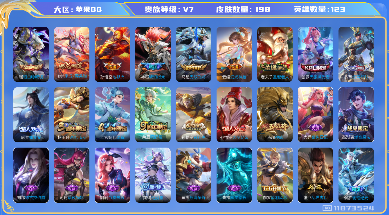 [11873524]V7 1典藏 6传说 123英雄 198皮肤 可修改实名 优质装备:银白咏叹调(倪克斯侍卫),地狱火,无双飞将,琥珀纪元马超 传说皮:乘龙·淬吴钩(孙策年限),幻光神枪 珍宝阁皮:优雅恋人 限定皮:逐霄战戟,鸣野蒿,神威(电光马子),遇见飞天,梁祝,天狼溯光者,如梦令-后羿,圣诞老人,孙行者,大圣娶亲 史诗皮:化蝶舞,怒海争锋,东方月初,琥珀纪元伽罗,百相守梦-百里守约,紫霞仙子,电玩小子(小书包),白龙吟,特工魅影,千年之狐,江河有灵,高渐离燃音魔法,冰冠公主,偶像歌手,暗夜猫娘,猫狗日记-大乔,乱世虎臣,节奏热浪,水果甜心,绅士熊喵,天才门将,星夜王子,功夫厨神,德古拉伯爵,暗隐猎兽者,幽灵船长,鬼剑武藏,心灵战警,纤云弄巧,逐浪之夏,箭羽风息,原初追逐者,圣诞狂欢,鹰眼统帅,魅力维加斯,未来纪元-赵云