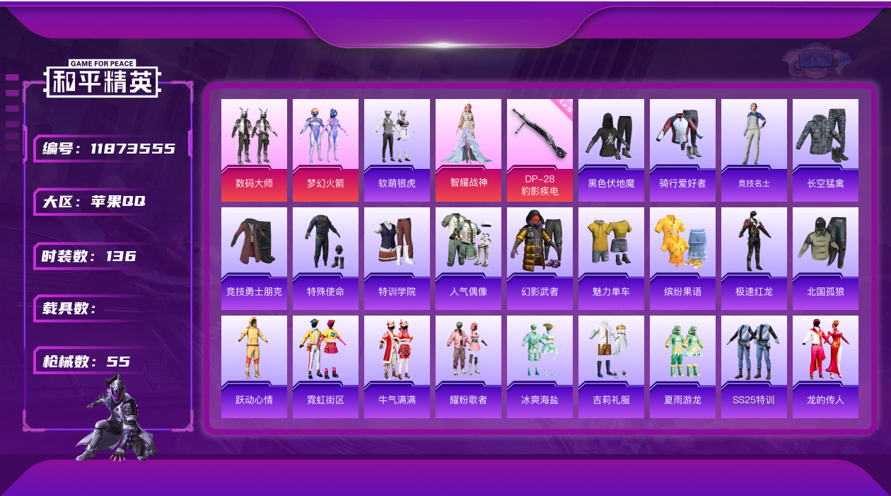 [11873555]3粉装 1特效枪 1印记 可二次 可修改实名 优质装备:梦幻火箭(新101)(新火箭少女101粉色套装),数码大师,智耀战神 热门装扮:软萌银虎 稀有枪皮:DP-28-豹影疾电 五级特效枪:五级DP-28-豹影疾电 紫色装扮:夏雨游龙,人气偶像,北国孤狼,SS33特训套装,顶瓜瓜,冰爽海盐,吉莉礼服,长空猛禽,霓虹街区,缤纷果语,跃动心情,骑行爱好者,魅力单车,黑色伏地魔,龙的传人,极速红龙,幻影武者,空岛之星,竞技勇士朋克,牛气满满,特殊使命,特训学院,竞技名士,SS25特训,SS26特训,大橘大利,耀粉歌者,SS32特训服(SS32特训套装) 优质战备:萌物绒绒飞行器,百万伏特降落伞,甜心宝贝降落伞,梦幻火箭飞行器,深海曼妙降落伞,神秘黑猫降落伞,香水柠檬降落伞