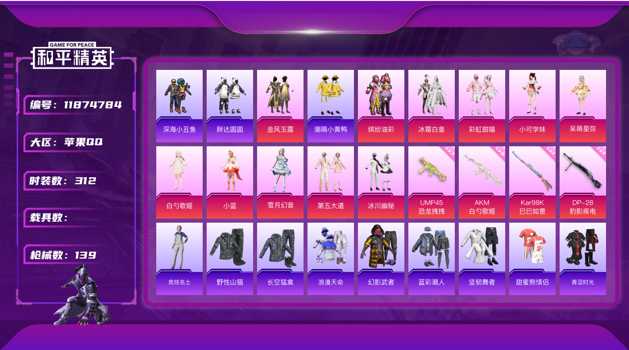 [11874784]11粉装 4特效枪 10印记 可二次 可修改实名 优质装备:金风玉露,缤纷油彩(猪妹猪脸妹),冰霜白皇,AKM白勺歌姬,UMP45恐龙拽拽,七级UMP45-恐龙拽拽,雪月幻音,Kar98K-巳巳如意 热门装扮:彩虹甜喵,冰川幽秘,第五大道,呆萌星弥,白勺歌姬,小可学妹,小蓝,胖达圆圆,潮萌小黄鸭,深海小丑鱼 稀有枪皮:DP-28-豹影疾电 六级特效枪:六级AKM-白勺歌姬 一级特效枪:一级Kar98K-巳巳如意,一级DP-28-豹影疾电 紫色装扮:田园牧歌,轻风白浪,和煦暖阳,SS22特训,SS23特训,幻彩翩翩,灵蜜圈圈,妙红点点,白兰地假日,娇憨猪猪,梦幻奶油,樱桃黑巧,萌趣咩咩,暖心熊熊,SS21特训,SS31特训套装,极速光影,SS30特训套装,云朵鹅,雪绒豹,SS33特训套装,青涩时光,顶瓜瓜,怪笑疯兔,SS19特训,粉团憨憨,野性山猫,长空猛禽,蓝彩潮人,蓝海鲸歌,飞行日记,鹤鸣,麻辣教官,龙的传人,龟仙人,龙魂突击队,香桃花海,涂山之恋,幻影武者,坚韧舞者,破蛋小黄鸡,甜蜜熊情侣,牛气满满,萝兰蝴蝶,纯真浪花,热情海星,迎夏光舞,暗影刺翼,异域银装,鱼渊荷华,玉兔迎春,燕燕于飞,都市丽猫,青团波波,糖糖葫芦,竞技名士,情公主,惊鸿侠骨,甜梦熊熊,神气柴柴,懵萌河马,SS24特训(SS24特训套装),SS25特训,月光变奏,绝对偶像,锦衣飞扬,舰行太空,无暇誓言,浪漫天命,淡雅花蕊,大橘大利,纯白誓言,SS32特训服(SS32特训套装),青玉碎影,绯格组合,萌黄之夏,光之冒险 优质战备:精灵梦叶罗丽降落伞,镜光幻境飞行器(镜光幻境飞行翼),萌物绒绒降落伞,时光之吻降落伞,动力核心飞行器,戏水时光降落伞,星月云朵降落伞,樱桃泡泡降落伞,月下星之子降落伞,彩虹独角兽降落伞,星夜魔法师降落伞,飞行翼-星夜魔法师,垂柳戏鸭降落伞,白勺歌姬降落伞,纯梦嫁纱降落伞,第五大道降落伞,甜心宝贝降落伞,童趣迷兔降落伞,洛神天依降落伞,飞行器-天之羽翼