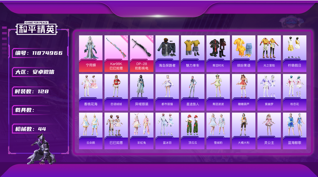 [11874966]1粉装 2特效枪 1印记 可二次 可修改实名 安全保护中 优质装备:宁雨蝶,Kar98K-巳巳如意 稀有枪皮:DP-28-豹影疾电 五级特效枪:五级Kar98K-巳巳如意,五级DP-28-豹影疾电 紫色装扮:SS31特训套装,SS30特训套装,云朵鹅,彩虹兔,雪绒豹,SS33特训套装,青涩时光,顶瓜瓜,灵公主,缤纷果语,蓝海鲸歌,魅力单车,香桃花海,柠萌假日,海岛探路者,星途旅人,异域银装,巳巳如意,都市丽猫,青团波波,糖糖葫芦,大橘大利,粉恋花,蓝冰羽,紫幽梦,SS32特训服(SS32特训套装),恋语绒绒,光之冒险 优质战备:星途旅人降落伞,英伦信使降落伞,千金淑猫降落伞,绯穹魔姬降落伞