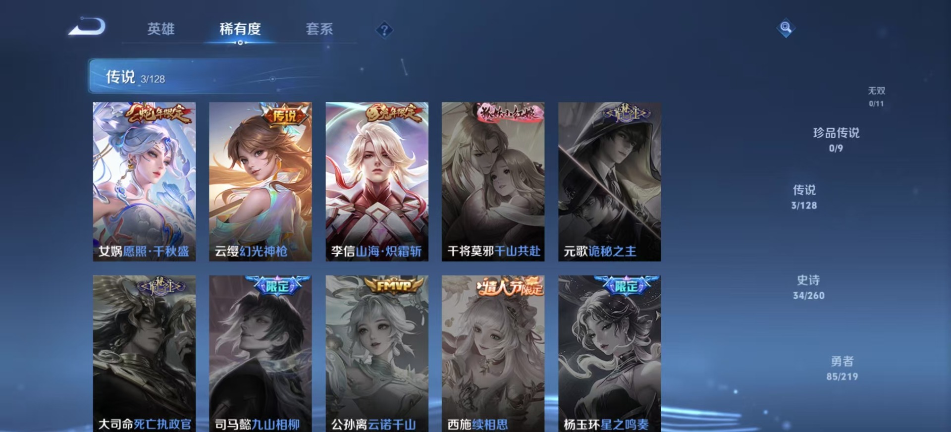 - PX_2099005-实名: 可修改 贵族等级: V7 英雄数: 125 皮肤数: 167 无双皮: 器灵·螭龙剑 传说皮: 冠军飞将,黄金白羊座,地狱之眼,神器·狴犴令,燃星之曲,画中仙,遇见神鼓,云诺千山 限定皮: 天魔缭乱,高山流水,五谷丰年,无限倾心-虞姬,鸣野蒿,逐霄战戟,愿照·千秋盛,愿照·众生和,愿照·山河定,愿照·岁时盈,愿照·福禄聚,愿照·九州拓