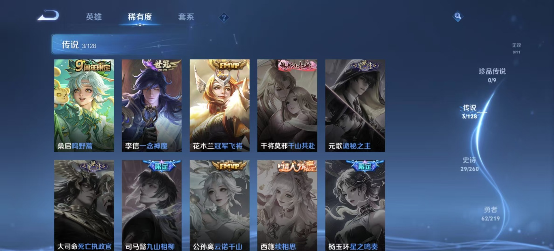 - PX_2099963-Q/永恒钻石/265皮肤/124英雄/3典藏/0珍品无双/0无双/1珍品传说/22传说/78史诗/8稀有英雄 【1 珍品传说】器灵·落星盏 嫦娥, 【3 典藏皮肤】鸣剑·曳影 李白,天鹅之梦 小乔,拾光映像 瑶, 【22 传说皮肤】启明星使 虞姬,云霓雀翎 虞姬,时之祈愿 瑶,地狱火 孙悟空,云鹰飞将 曜,游龙清影 西施,遇见胡旋 貂蝉,猫影幻舞 貂蝉,仲夏夜之梦 貂蝉,海洋