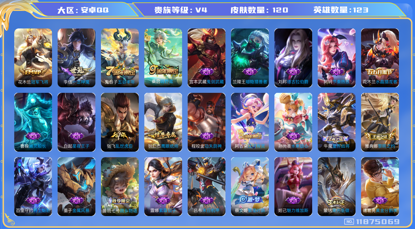 [11875069]V4 3传说 123英雄 120皮肤 可修改实名 优质装备:冠军飞将,一念神魔 珍宝阁皮:蔷薇恋人 限定皮:鸣野蒿,五谷丰年 史诗皮:星界战将,蔬乡物语(鲁班七号),紫霞仙子,黄金分割率,特工魅影,江河有灵,蒙恬荣光圣徽,末日机甲-吕布,乱世虎臣,节奏热浪,水果甜心,天才门将,星夜王子,功夫厨神,德古拉伯爵,暗隐猎兽者,幽灵船长,鬼剑武藏,繁星吟游(呼啦呼啦),水晶猎龙者,金属风暴,鹰眼统帅,魅力维加斯,黎明之约