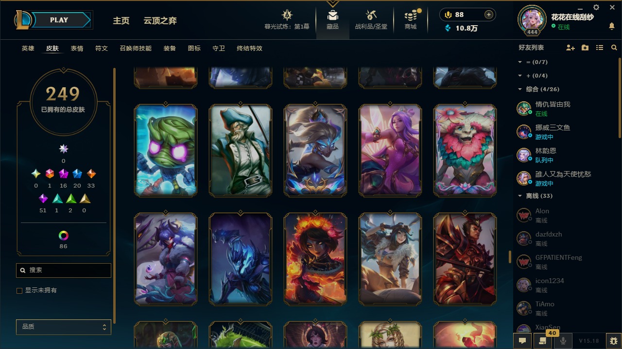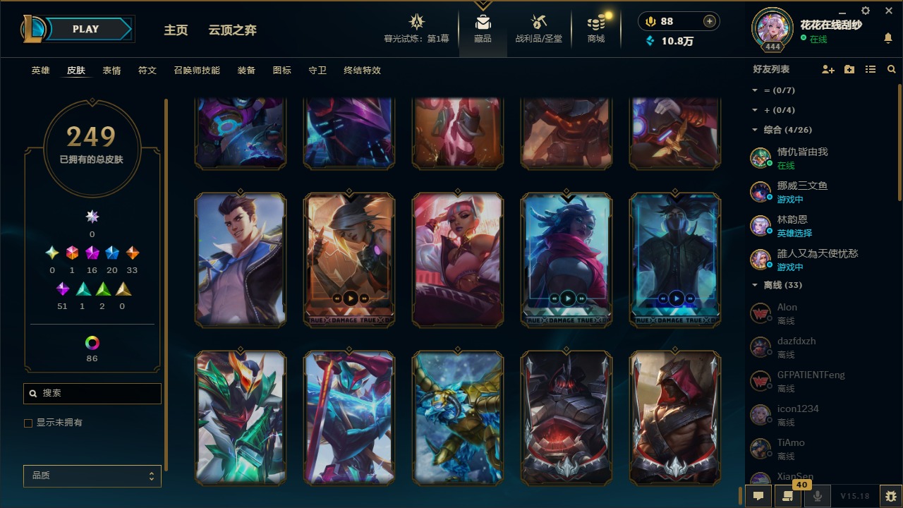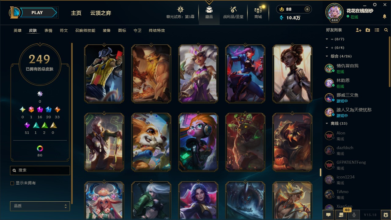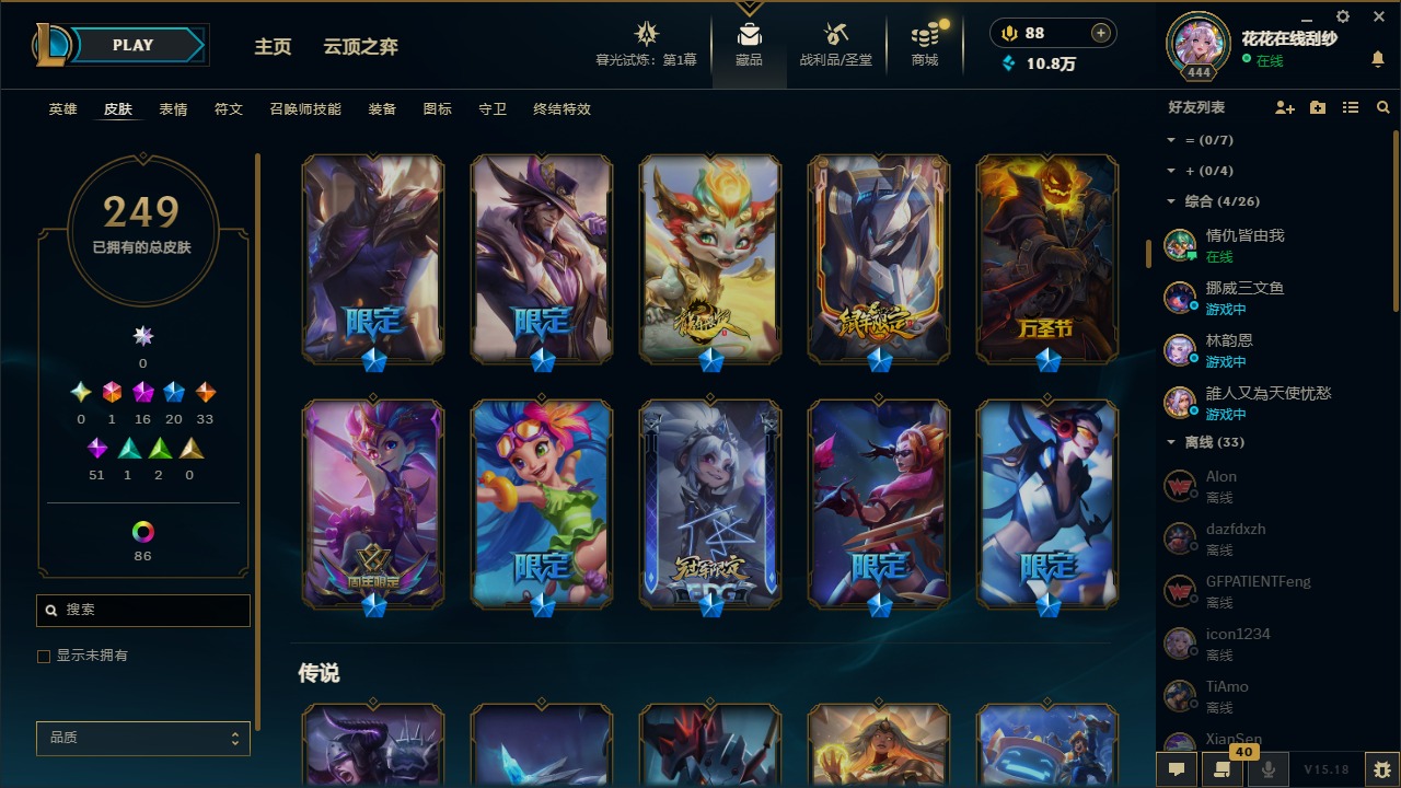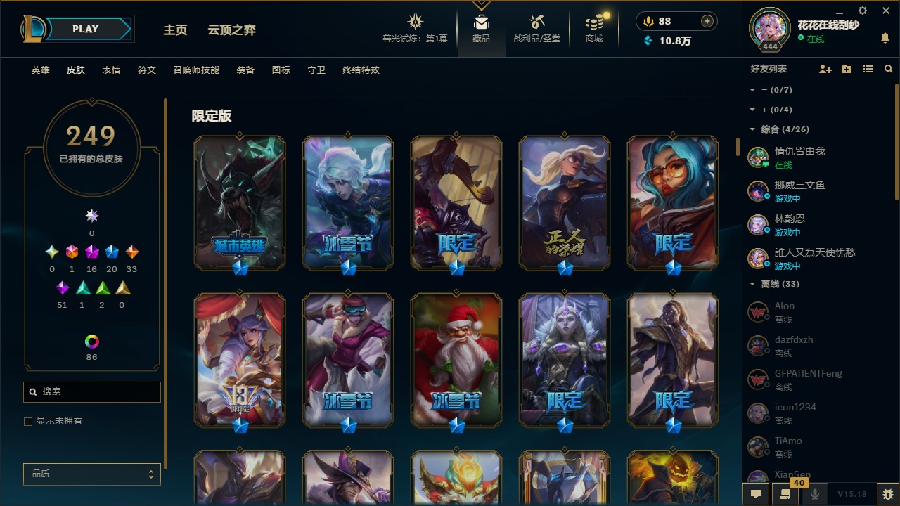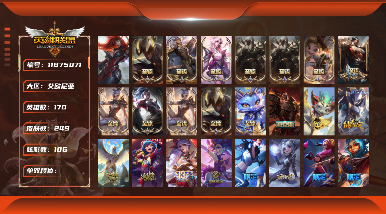 [11875071]1终极 16神话 20限定 33传说 51史诗 249皮肤 106炫彩 170英雄 可二次 可修改实名 优质装备:至臻 腥红之月 亚托克斯,至臻 黑夜使者 李青,至臻 玉剑传说 武剑仙,至臻 原计划:逆流 塞拉斯,至臻 奥术师 佐伊,源代码 乐芙兰,防爆天使 凯尔,暗影 沃里克,都铎王朝 图奇,武装战姬,幻灵战斗蝠 薇恩 梦幻强袭,无畏骑士 瑟庄妮 赤子初心,至臻 魔女 阿卡丽,可爱可爱粉红红 布里茨,至臻 黑夜使者 李青(2022),至臻 腥红之月 亚托克斯(2022),至臻 玉剑传说 武剑仙(2022),净雪之月 莫甘娜 冬虹,至臻 人工智能 悠米,魔女 阿卡丽 虚荣,至臻 凯旋将军 德莱厄斯,女帝 格温 纹章之刻印·果决,至臻 灵魂莲华 拉克丝 海克斯:恐惧新星 德莱厄斯 赛季限定皮:胜利之运 崔斯特,胜利之剑 剑魔,胜利枪神 卢锡安,胜利女神 瑟庄妮 冠军限定系列:S3 SKT T1 婕拉,S5 SKT T1 蜘蛛,S11 EDG 佐伊 冰雪节限定:北极星使者 彗,魄罗骑士 瑟庄妮,圣诞老人 酒桶 泳池派对:泳池派对 吉格斯,泳池派对 佐伊,海之歌 泽丽 万圣节限定:无头骑士 人马 年限:天龙之子 斯莫德,鼠年 瑟提 周年:女帝 格温,8周年 佐伊,10周年 安妮,10周年 凤凰