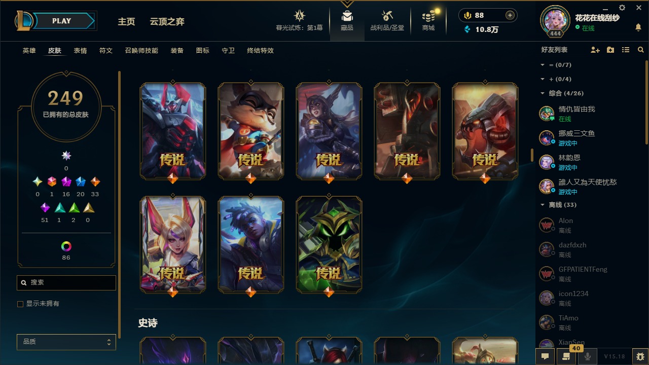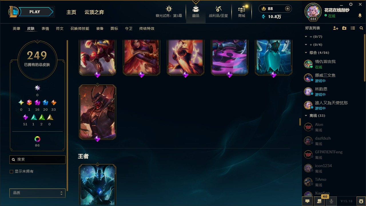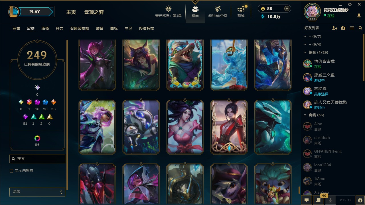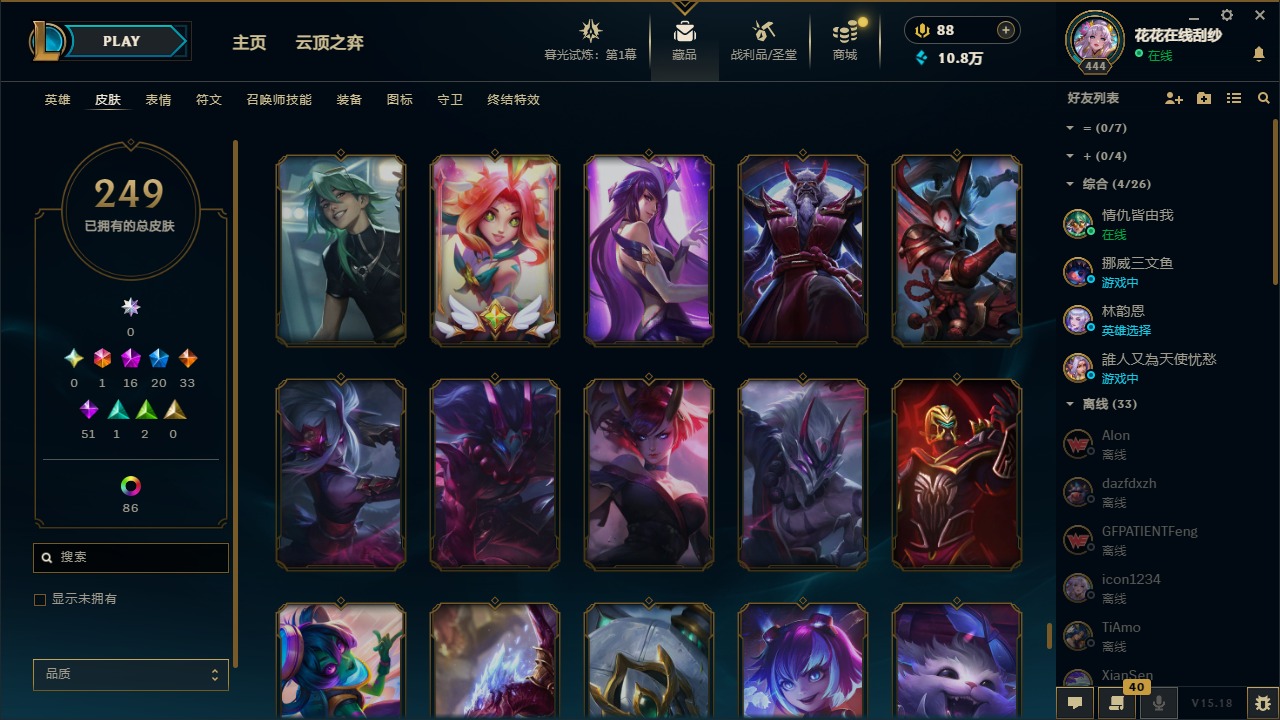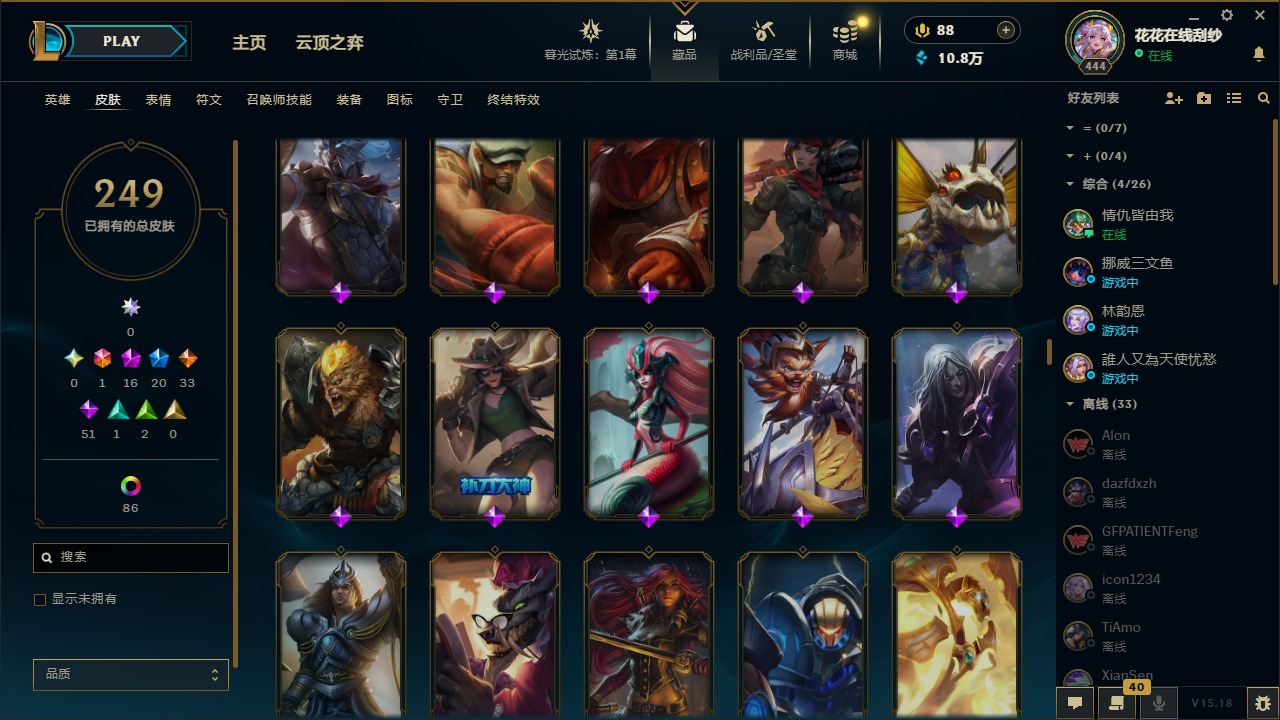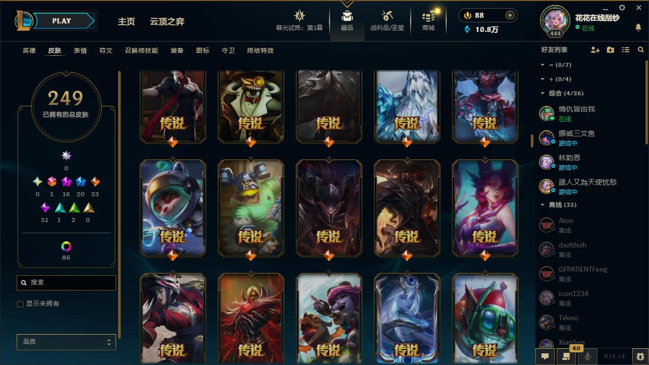 [11875071]1终极 16神话 20限定 33传说 51史诗 249皮肤 106炫彩 170英雄 可二次 可修改实名 优质装备:至臻 腥红之月 亚托克斯,至臻 黑夜使者 李青,至臻 玉剑传说 武剑仙,至臻 原计划:逆流 塞拉斯,至臻 奥术师 佐伊,源代码 乐芙兰,防爆天使 凯尔,暗影 沃里克,都铎王朝 图奇,武装战姬,幻灵战斗蝠 薇恩 梦幻强袭,无畏骑士 瑟庄妮 赤子初心,至臻 魔女 阿卡丽,可爱可爱粉红红 布里茨,至臻 黑夜使者 李青(2022),至臻 腥红之月 亚托克斯(2022),至臻 玉剑传说 武剑仙(2022),净雪之月 莫甘娜 冬虹,至臻 人工智能 悠米,魔女 阿卡丽 虚荣,至臻 凯旋将军 德莱厄斯,女帝 格温 纹章之刻印·果决,至臻 灵魂莲华 拉克丝 海克斯:恐惧新星 德莱厄斯 赛季限定皮:胜利之运 崔斯特,胜利之剑 剑魔,胜利枪神 卢锡安,胜利女神 瑟庄妮 冠军限定系列:S3 SKT T1 婕拉,S5 SKT T1 蜘蛛,S11 EDG 佐伊 冰雪节限定:北极星使者 彗,魄罗骑士 瑟庄妮,圣诞老人 酒桶 泳池派对:泳池派对 吉格斯,泳池派对 佐伊,海之歌 泽丽 万圣节限定:无头骑士 人马 年限:天龙之子 斯莫德,鼠年 瑟提 周年:女帝 格温,8周年 佐伊,10周年 安妮,10周年 凤凰