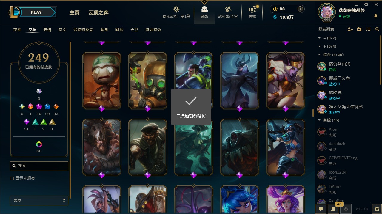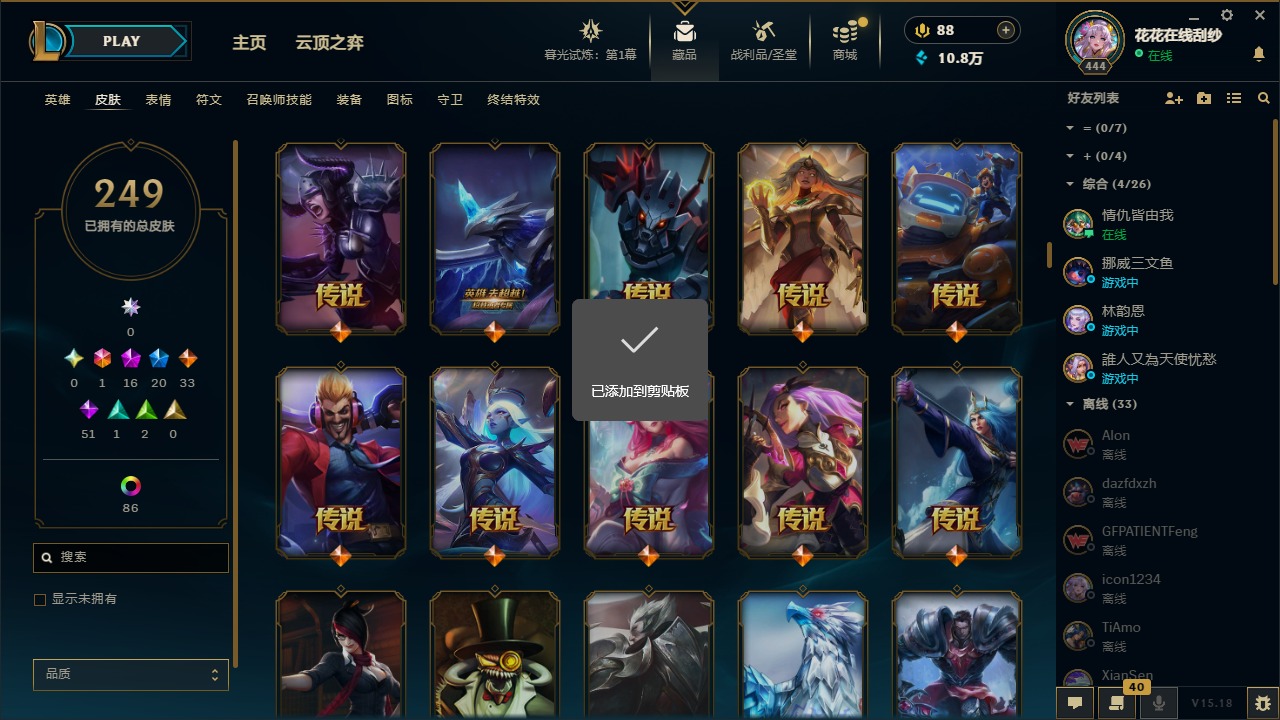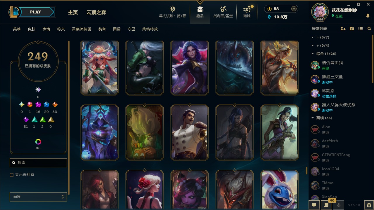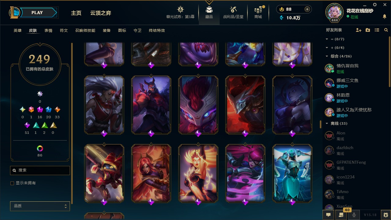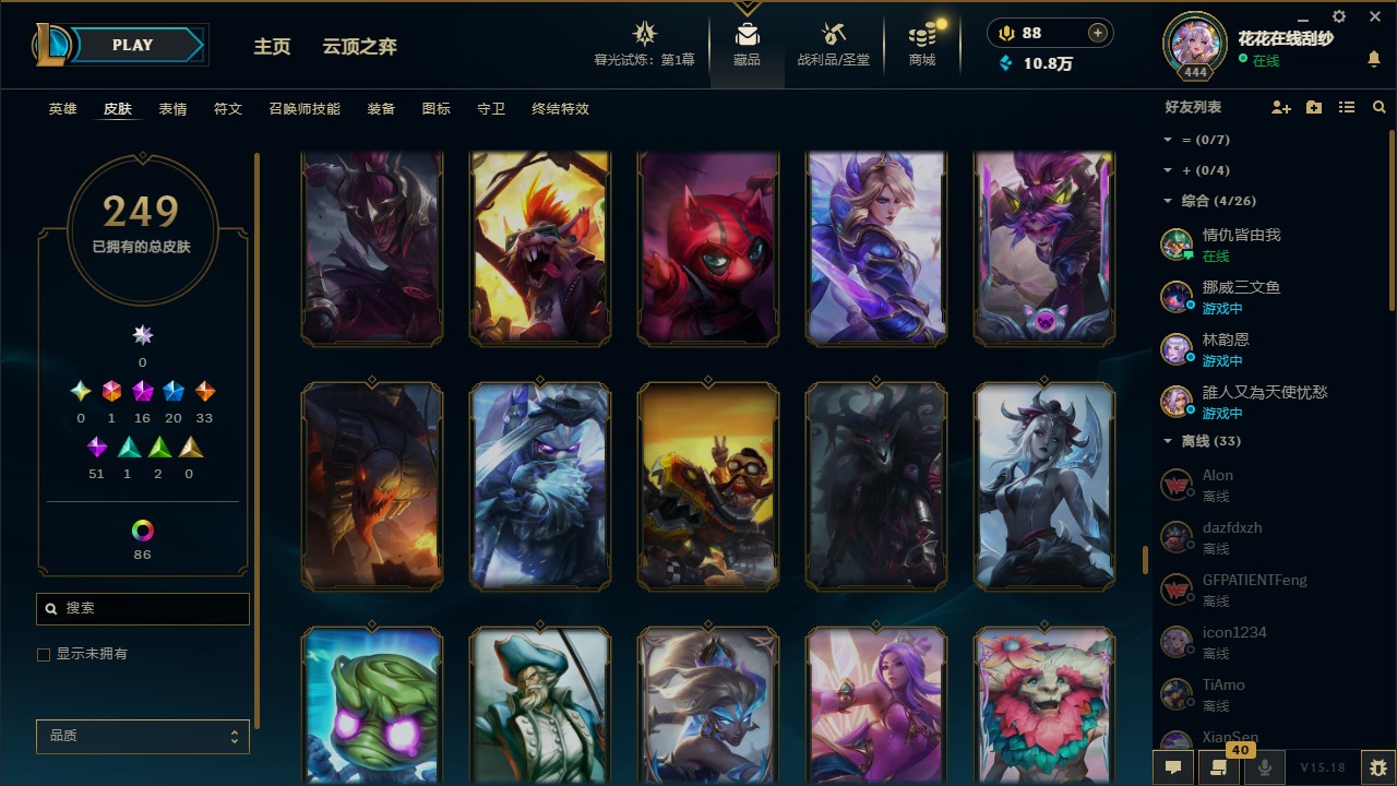 [11875071]1终极 16神话 20限定 33传说 51史诗 249皮肤 106炫彩 170英雄 可二次 可修改实名 优质装备:至臻 腥红之月 亚托克斯,至臻 黑夜使者 李青,至臻 玉剑传说 武剑仙,至臻 原计划:逆流 塞拉斯,至臻 奥术师 佐伊,源代码 乐芙兰,防爆天使 凯尔,暗影 沃里克,都铎王朝 图奇,武装战姬,幻灵战斗蝠 薇恩 梦幻强袭,无畏骑士 瑟庄妮 赤子初心,至臻 魔女 阿卡丽,可爱可爱粉红红 布里茨,至臻 黑夜使者 李青(2022),至臻 腥红之月 亚托克斯(2022),至臻 玉剑传说 武剑仙(2022),净雪之月 莫甘娜 冬虹,至臻 人工智能 悠米,魔女 阿卡丽 虚荣,至臻 凯旋将军 德莱厄斯,女帝 格温 纹章之刻印·果决,至臻 灵魂莲华 拉克丝 海克斯:恐惧新星 德莱厄斯 赛季限定皮:胜利之运 崔斯特,胜利之剑 剑魔,胜利枪神 卢锡安,胜利女神 瑟庄妮 冠军限定系列:S3 SKT T1 婕拉,S5 SKT T1 蜘蛛,S11 EDG 佐伊 冰雪节限定:北极星使者 彗,魄罗骑士 瑟庄妮,圣诞老人 酒桶 泳池派对:泳池派对 吉格斯,泳池派对 佐伊,海之歌 泽丽 万圣节限定:无头骑士 人马 年限:天龙之子 斯莫德,鼠年 瑟提 周年:女帝 格温,8周年 佐伊,10周年 安妮,10周年 凤凰