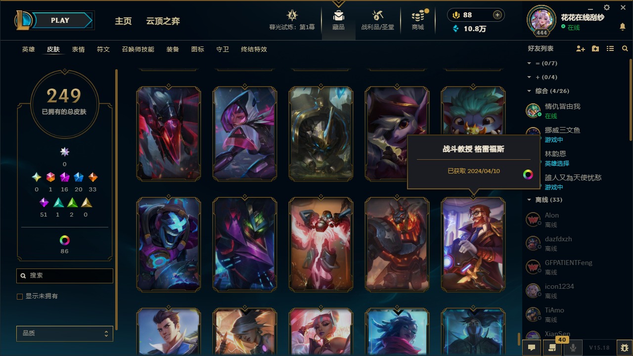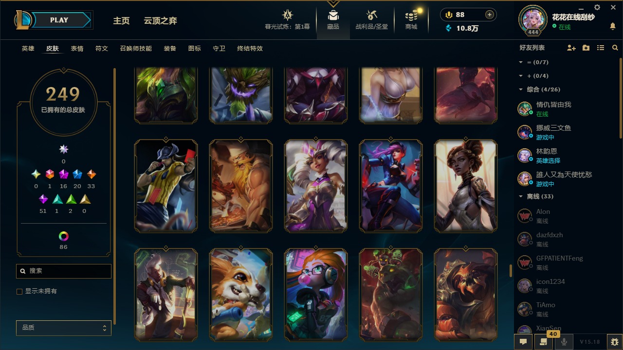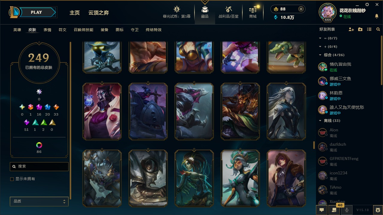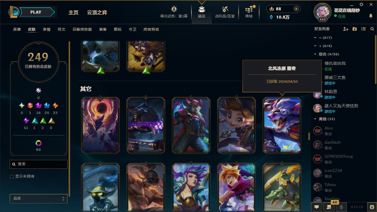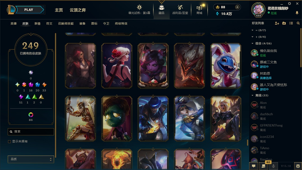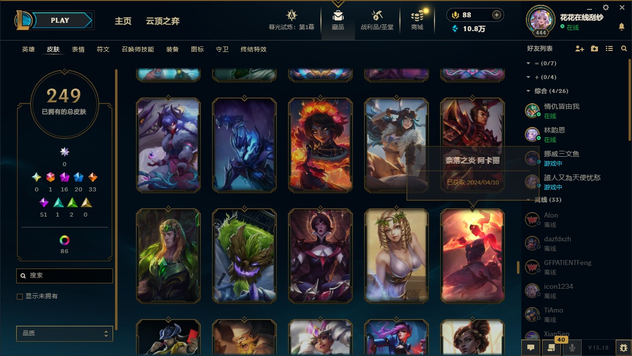 [11875071]1终极 16神话 20限定 33传说 51史诗 249皮肤 106炫彩 170英雄 可二次 可修改实名 优质装备:至臻 腥红之月 亚托克斯,至臻 黑夜使者 李青,至臻 玉剑传说 武剑仙,至臻 原计划:逆流 塞拉斯,至臻 奥术师 佐伊,源代码 乐芙兰,防爆天使 凯尔,暗影 沃里克,都铎王朝 图奇,武装战姬,幻灵战斗蝠 薇恩 梦幻强袭,无畏骑士 瑟庄妮 赤子初心,至臻 魔女 阿卡丽,可爱可爱粉红红 布里茨,至臻 黑夜使者 李青(2022),至臻 腥红之月 亚托克斯(2022),至臻 玉剑传说 武剑仙(2022),净雪之月 莫甘娜 冬虹,至臻 人工智能 悠米,魔女 阿卡丽 虚荣,至臻 凯旋将军 德莱厄斯,女帝 格温 纹章之刻印·果决,至臻 灵魂莲华 拉克丝 海克斯:恐惧新星 德莱厄斯 赛季限定皮:胜利之运 崔斯特,胜利之剑 剑魔,胜利枪神 卢锡安,胜利女神 瑟庄妮 冠军限定系列:S3 SKT T1 婕拉,S5 SKT T1 蜘蛛,S11 EDG 佐伊 冰雪节限定:北极星使者 彗,魄罗骑士 瑟庄妮,圣诞老人 酒桶 泳池派对:泳池派对 吉格斯,泳池派对 佐伊,海之歌 泽丽 万圣节限定:无头骑士 人马 年限:天龙之子 斯莫德,鼠年 瑟提 周年:女帝 格温,8周年 佐伊,10周年 安妮,10周年 凤凰