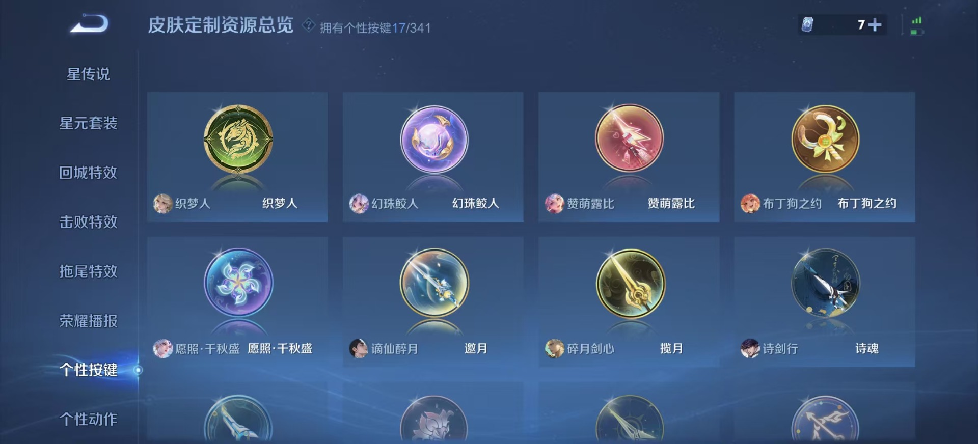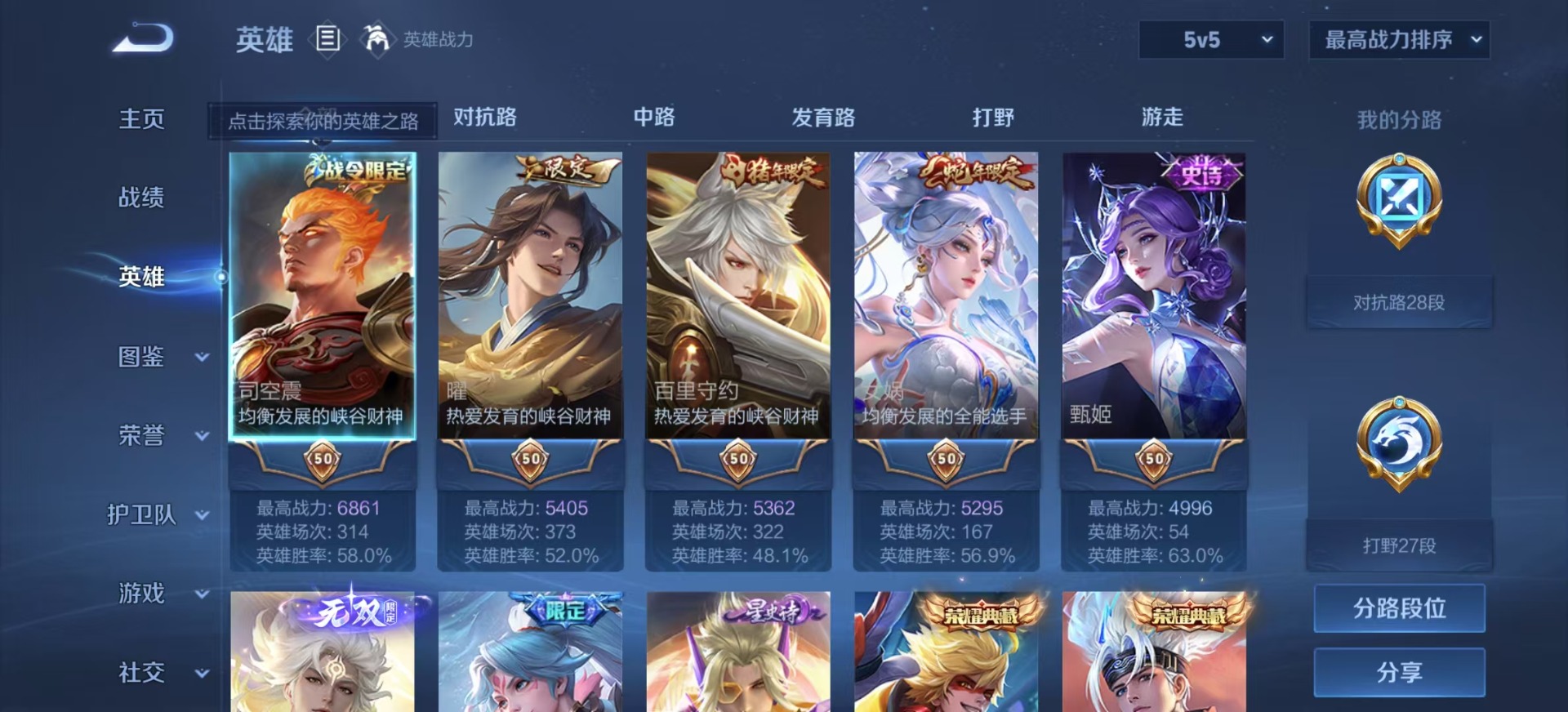 - PX_2084335-贵族等级: V7 英雄数: 95 皮肤数: 86 无双皮: 器灵·螭龙剑 珍品传说: 江户川柯南,怪盗基德 星传说: 幽冥之眼 传说皮: 久胜战神,地狱之眼,胖达荣荣,大乔-时之奇旅,星之鸣奏 限定皮: 鸣野蒿,逐霄战戟,愿照·众生和