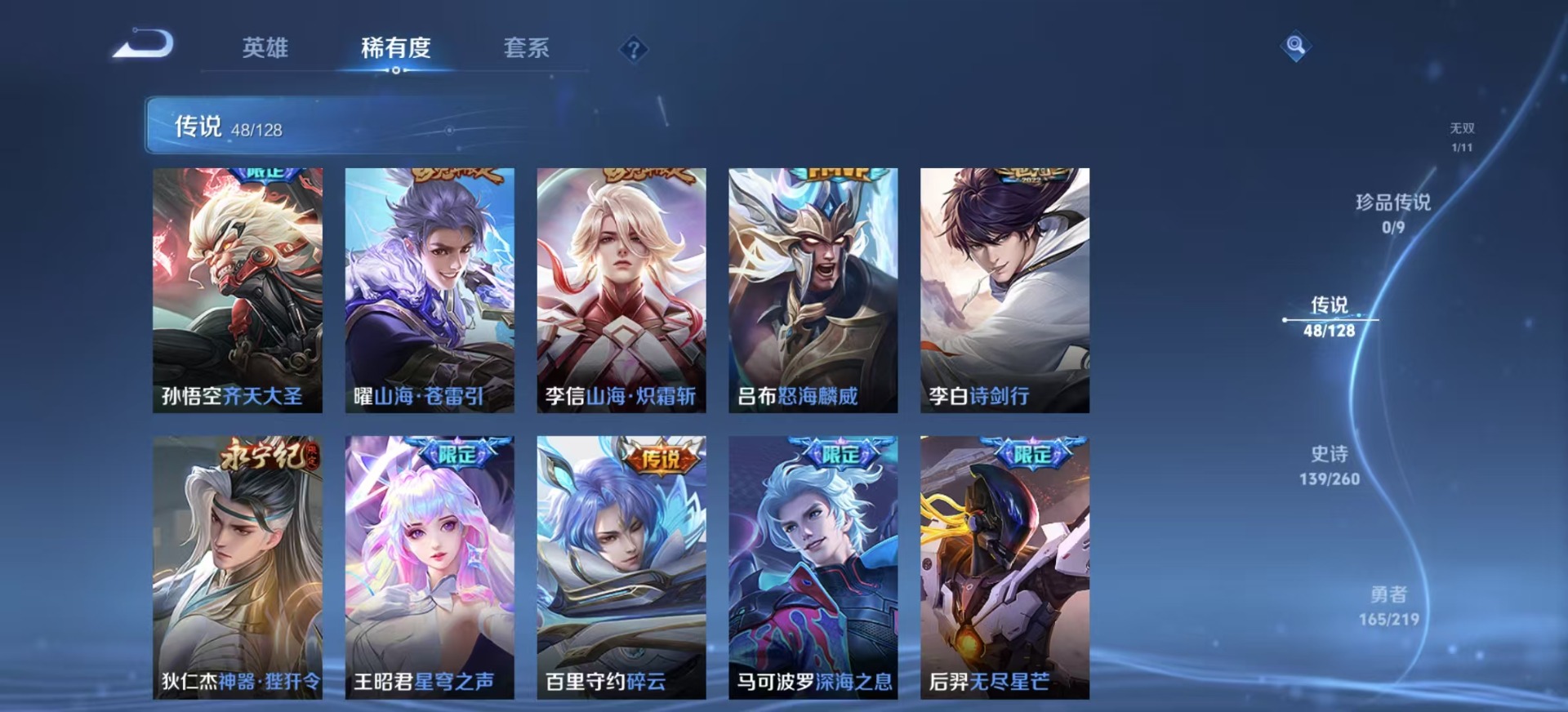 金蝉唐三藏,夏侯惇匿光决锋者,黄忠烈魂,铠青龙志,廉颇寅虎·御盾,伽罗太华,赵云百木心枪,孙尚香异界灵契,鲁班七号寅虎·瑞焰,后羿无尽星芒,吕布御风骁将,露娜启示之音,镜匿光追影者,公孙离玉兔公主,公孙离蜜橘之夏,鲁班大师匿光启智者,裴擒虎寅虎·赤拳,上官婉儿梁祝,上官婉儿神器·万象笔,上官婉儿天狼绘梦者,李白诗剑行,花木兰瑞麟志,马可波罗山海·玄木吟,马可波罗深海之息,西施至美·乘鲤谣,桑启鸣野蒿,女娲补天,女娲愿照·千秋盛,孙悟空孙行者,马超神威,韩信傲雪梅枪,韩信飞衡,韩信逐梦之影,百里守约朱雀志,墨子降魔,王昭君凤凰于飞,王昭君星穹之声