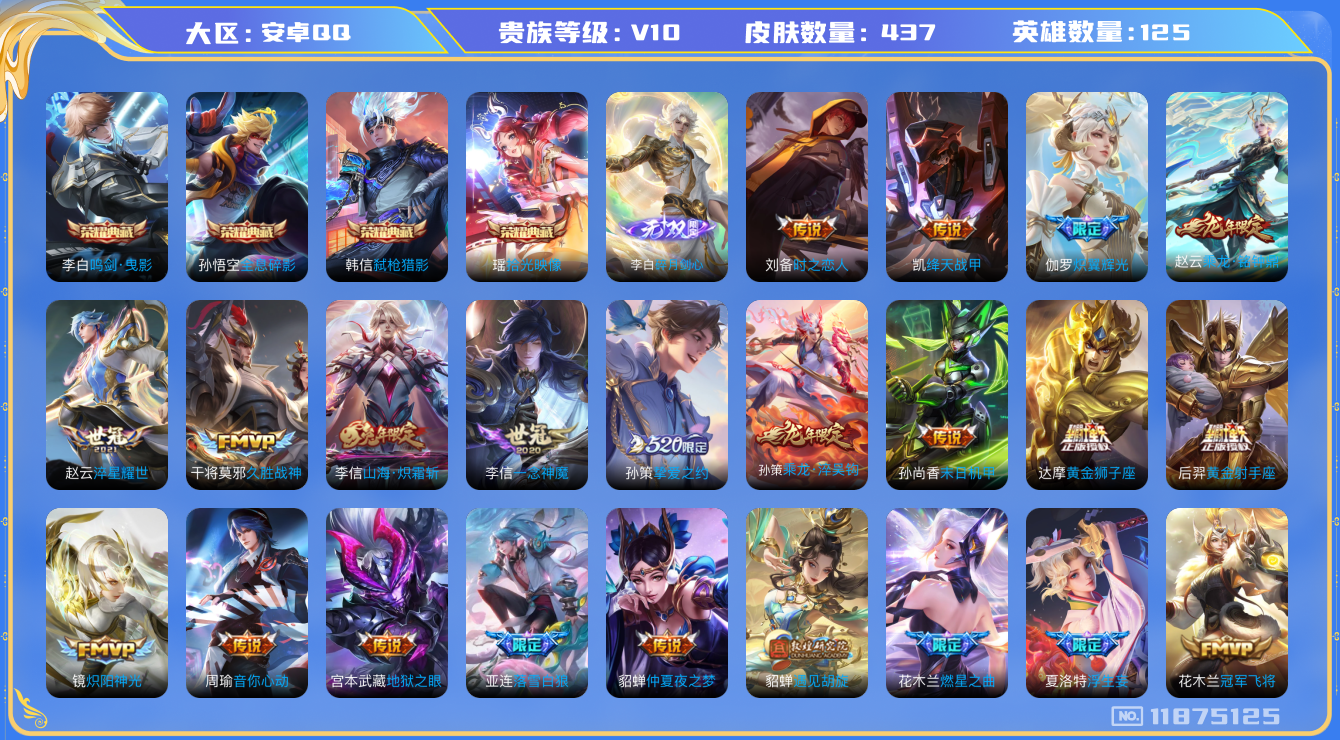 [11875125]V10 4典藏 1无双 48传说 125英雄 437皮肤 可修改实名 优质装备:鸣剑·曳影,全息碎影(猴子典藏),弑枪猎影(韩信典藏),碎月剑心(李白无双),拾光映像(瑶典藏),黄金狮子座,黄金射手座,冠军飞将,云鹰飞将(小将军),绛天战甲(鸡嘴战神),久胜战神,炽阳神光,一念神魔,末日机甲-孙尚香(绿蚂蚱),仲夏夜之梦(大飞蛾),地狱之眼,音你心动-周瑜,李逍遥,时之恋人-刘备(电焊工),淬星耀世,超时空战士-狄仁杰,遇见胡旋,挚爱之约,无双飞将,碎云,神器·狴犴令,山海·炽霜斩(李信年限),山海·苍雷引(电光曜子),炽翼辉光(娃娃菜牛角包),燃星之曲,浮生妄,艾琳觅芳踪,涂山容容 传说皮:乘龙·铭钟鼎(赵云年限),乘龙·淬吴钩(孙策年限),落雪白狼,续相思 珍宝阁皮:妄想食味,女武神,玩趣恶龙 限定皮:愿照·千秋盛(女娲年限),鸣野蒿,凤求凰(白切鸡),凤凰于飞,太华(伽罗年限),武陵仙君(小桃花),异界灵契(白毛香),傲雪梅枪,补天,星穹之声,神威(电光马子),飞衡(韩信年限),瑞麟志(木兰年限),至美·乘鲤谣,遇见飞天,高山流水,诗剑行,齐天大圣,匿光决锋者,怒海麟威,降魔,五谷丰年,青龙志(铠年限),梁祝,御风骁将(吕布年限),烈魂,天狼绘梦者,逐梦之影,朱雀志(守约年限),孙行者,蜜橘之夏,匿光追影者,寅虎·御盾(廉颇年限),寅虎·瑞焰(虎皮蛋子),寅虎·赤拳(老虎年限),百木心枪,玉兔公主,启示之音,无尽星芒,深海之息(深海大菠萝),唐三藏,匿光启智者,神器·万象笔,山海·玄木吟(马可年限) 史诗皮:赞萌露比,鸭鸭历险记-刘禅,化蝶舞,灵蛊蚀心,星界战将,谪仙醉月,龙之律动,石田雨龙,百相守梦-周瑜,茶境仙,幻珠鲛人,怒海争锋,破空之剑,蔬乡物语(鲁班七号),百相守梦-黄忠,织梦人,遇见神鹿,紫霞仙子,苍穹之光,电玩小子(小书包),白龙吟,黄金分割率,特工魅影,千年之狐,永昼,江河有灵,鹤归松栖(赵怀真),魅语,百解令(蒙犽),高渐离燃音魔法,蒙恬荣光圣徽,冰冠公主,青蛇,偶像歌手,晚萤,电玩·爆裂旋风,暗夜猫娘,龙骑士(小龙虾),末日机甲-吕布,猫狗日记-孙策,猫狗日记-大乔,时之恋人-孙尚香,乱世虎臣,节奏热浪,修罗,女仆咖啡,摇滚巨星,水果甜心,绅士熊喵,天才门将,星夜王子,心灵骇客,时之奇旅-安琪拉,功夫厨神,德古拉伯爵,暗隐猎兽者,幽灵船