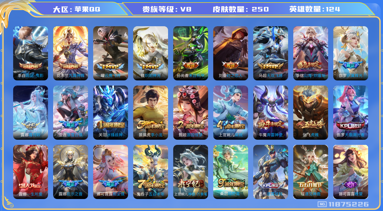 [11875226]【商品标题】:苹果Q-V8-永恒钻石II段位-124英雄-250皮肤-2典藏-0珍品无双-0无双-0珍品传说-13传说-74史诗
