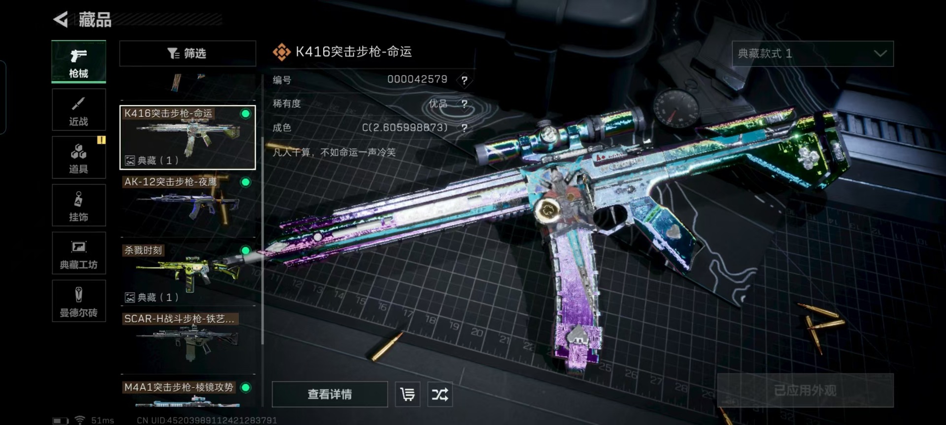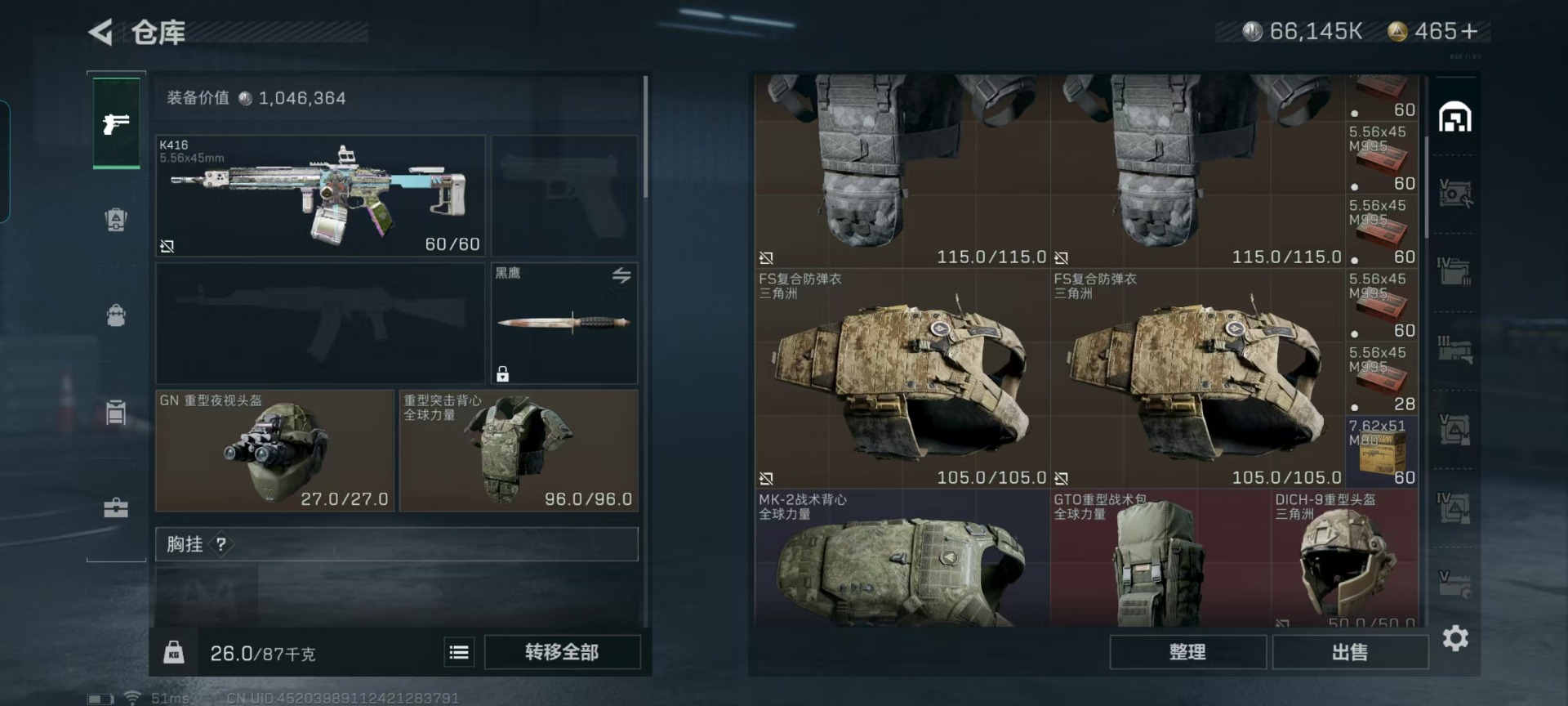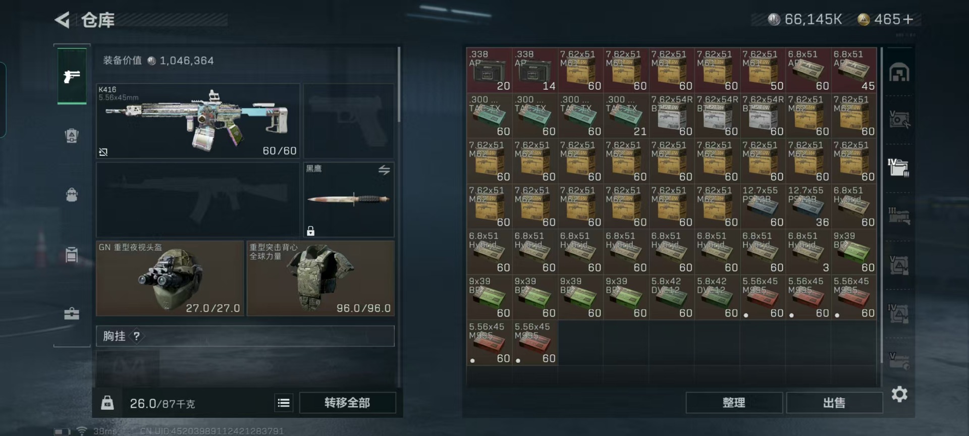 [11875545]总资产:287.5M 6传说枪械 哈夫币:66.145K 可二次 可修改实名 优质装备:K416突击步枪-命运(典藏),SCAR-H战斗步枪-电玩高手 烽火地带段位:钻石 全面战场段位:无段位 传说武器皮肤:SR-25射手步枪-水墨云图,SCAR-H战斗步枪-铁艺苍穹,AK-12突击步枪-夜鹰,SMG45冲锋枪-骑士