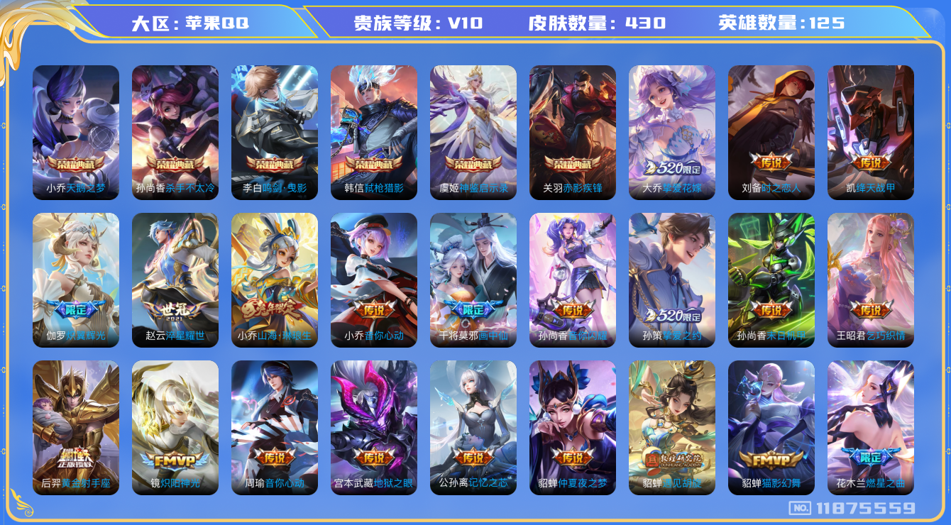 [11875559]V10 6典藏 44传说 125英雄 430皮肤 可修改实名 优质装备:天鹅之梦(小乔典藏),杀手不太冷,鸣剑·曳影,赤影疾锋,弑枪猎影(韩信典藏),神鉴启示录,黄金射手座,冠军飞将,云鹰飞将(小将军),绛天战甲(鸡嘴战神),猫影幻舞,炽阳神光,云霓雀翎,末日机甲-孙尚香(绿蚂蚱),仲夏夜之梦(大飞蛾),音你心动-小乔,零号·赤焰,地狱之眼,飞鸢探春,音你心动-周瑜,胖达荣荣,乞巧织情,时之恋人-刘备(电焊工),游龙清影(小青龙),淬星耀世,遇见胡旋,挚爱之约,挚爱花嫁,无双飞将,音你闪耀(rap皮),碎云,山海·琳琅生(小乔年限),炽翼辉光(娃娃菜牛角包),燃星之曲,画中仙,浮生妄,记忆之芯(机甲兔),澜逐花归海,艾琳觅芳踪 珍宝阁皮:妄想食味,蔷薇恋人 限定皮:愿照·九州拓(澜年限),逐霄战戟,陌上桑,鸣野蒿,至尊宝,武陵仙君(小桃花),傲雪梅枪,寅虎·展翼(孙膑年限),前尘镜,绯月行,时雨天司(水龙头),神威(电光马子),山海·碧波行(瑶年限),瑞麟志(木兰年限),高山流水,诗剑行,降魔,五谷丰年,幽恒(沐浴露),梁祝,天狼狩猎者,天狼溯光者,天狼绘梦者,李小龙,朱雀志(守约年限),如梦令-后羿,默契交锋-花木兰,孙行者,一生所爱,匿光追影者,寅虎·御盾(廉颇年限),寅虎·瑞焰(虎皮蛋子),寅虎·心曲(虎婆),寅虎·赤拳(老虎年限),百木心枪,玉兔公主,启示之音,唐三藏,匿光启智者,神器·万象笔,山海·玄木吟(马可年限) 史诗皮:器灵·浮梦炉,化蝶舞,雪豹·霜爪,小牛鸭,茶境仙,撼地雄心,破空之剑,战舞者,东方月初,埋骨钱,怒海争锋,谪仙醉月,决胜骁骑,上官婉儿群星魔术团,蔬乡物语(鲁班七号),超元猎域,乘龙·聚宝船(安琪拉年限),百相守梦-百里守约,遇见神鹿,紫霞仙子,苍穹之光,电玩小子(小书包),白龙吟,黄金分割率,特工魅影,千年之狐,永昼,匿光破解者,百相守梦(刘备),电玩·爆裂旋风,江河有灵,百解令(蒙犽),高渐离燃音魔法,蒙恬荣光圣徽,偶像歌手,龙骑士(小龙虾),暗夜猫娘,魅语,无限星赏官,晚萤,冰冠公主,青蛇,末日机甲-吕布,猫狗日记-孙策,猫狗日记-大乔,时之恋人-孙尚香,乱世虎臣,节奏热浪,修罗,女仆咖啡,摇滚巨星,水果甜心,绅士熊喵,天才门将,星夜王子,心灵骇客,时之奇旅-安琪拉,功夫厨神,德古拉伯爵,暗隐猎兽者,幽灵船长,鬼剑武藏,暗渊