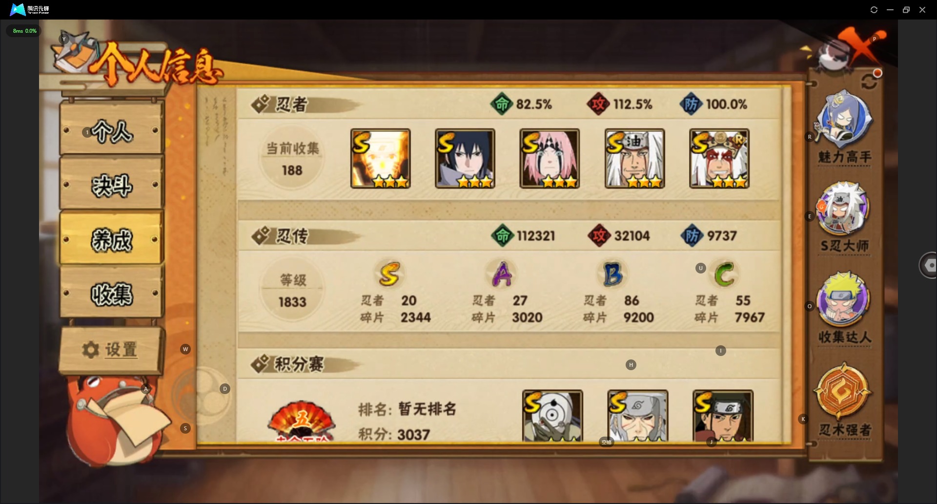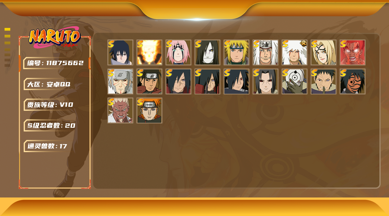 [11875662]V10 20S忍 27A忍 17通灵 783.2W战力 可二次 可修改实名 优质装备:宇智波鼬「秽土转生」,宇智波斑「秽土转生」,宇智波斑 「木叶创立」,千手扉间「秽土转生」,纲手「百豪」,千手柱间,迈特凯「死门」,宇智波带土 「忍界大战」,“宇智波斑” 「白面具」,漩涡鸣人 「九喇嘛连结」,春野樱 「忍界大战」,神秘面具男 「红夜之刃」,宇智波佐助「永恒万花筒」,宇智波斑「秽土转生·解」,艾「忍界大战」 S级忍者:自来也 「舞之豪杰」,佩恩「天道」,波风水门,大蛇丸,自来也