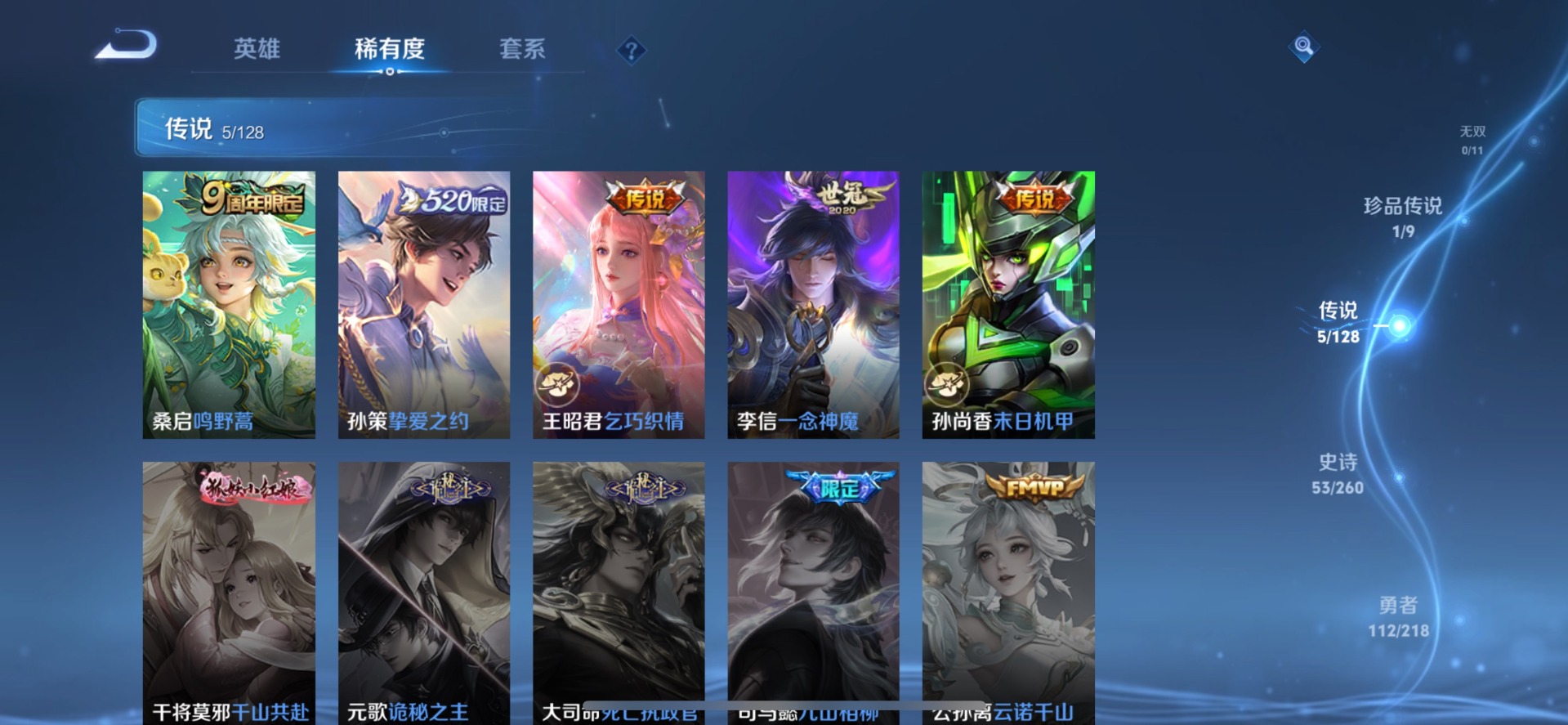 夏侯惇朔风刀,老夫子醍醐杖,沈梦溪大漠名商,盾山御銮,曹操烛龙,苏烈千军破阵,典韦穷奇,达摩沙漠行僧,牛魔御旌,兰陵王金庭之子,裴擒虎擒涛扼浪,鲁班大师探海日志,明世隐疑决卦,白起狰,鬼谷子原初探秘者,张良古海寻踪,桑启海盐诗旅,狄仁杰万华元夜,芈月重明,程咬金演武夺筹,弈星混沌棋,虞姬凯尔特女王,米莱狄御霄,狂铁御狮,太乙真人饕餮