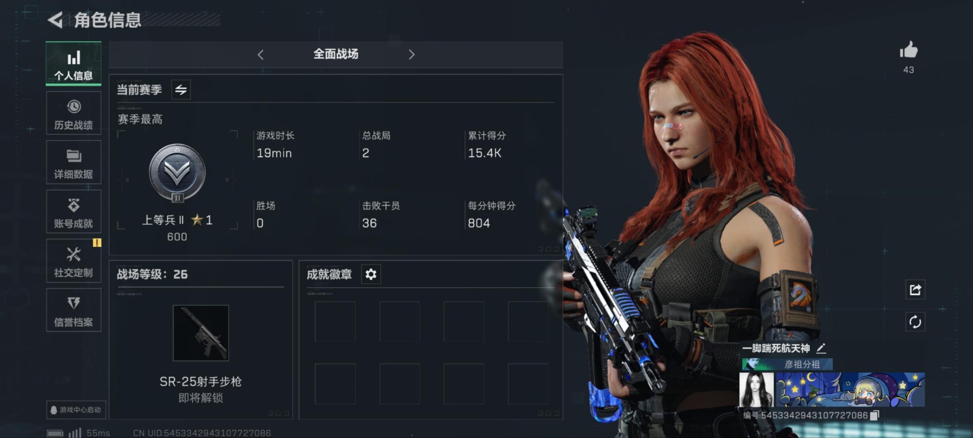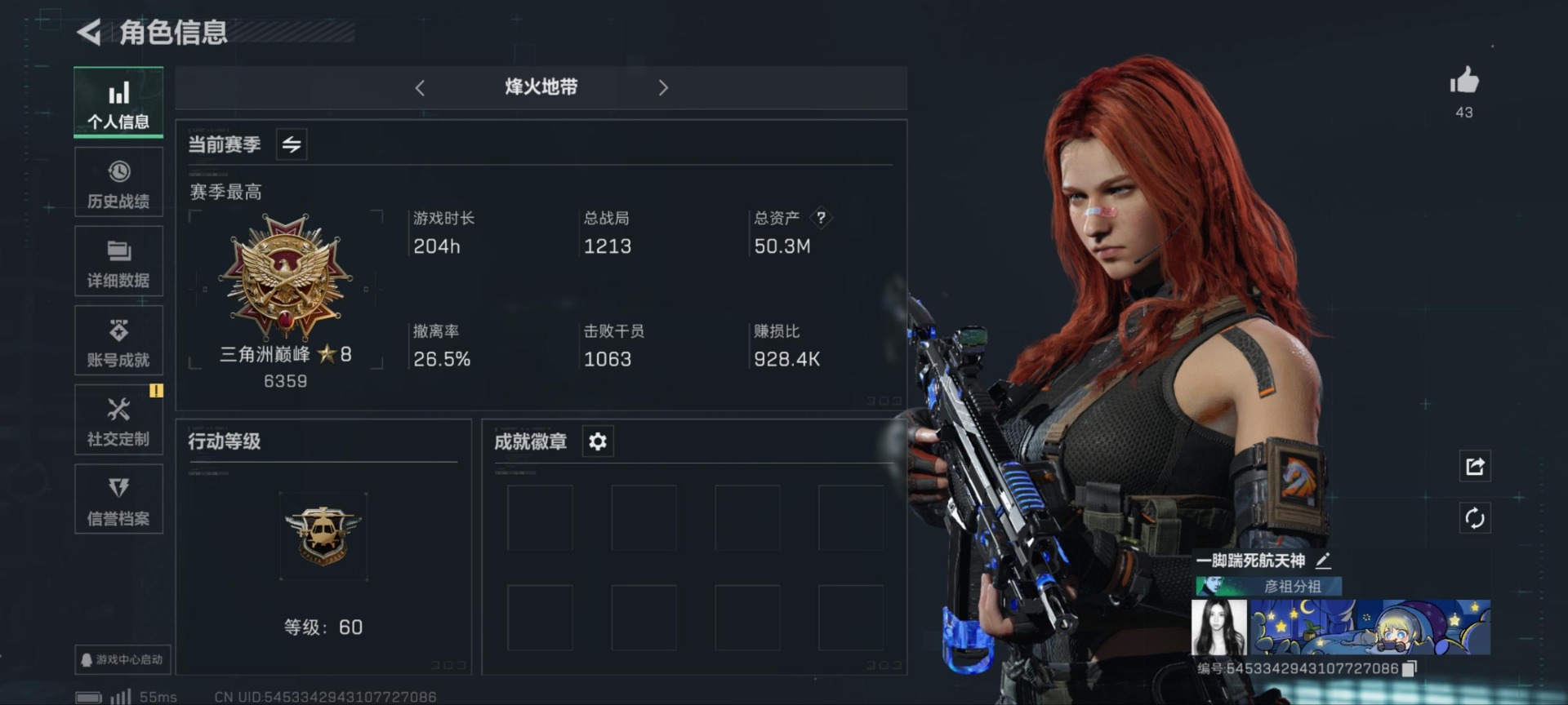 [11875801]总资产:50.3M 1干员外观 2近战传说 19传说枪械 哈夫币:536.826K 高级安全箱(9.17到期) 可二次 可修改实名 优质装备:近战-黑海,近战-北极星 烽火地带段位:三角洲巅峰 全面战场段位:上等兵 传说武器皮肤:SMG45冲锋枪-骑士,UZI冲锋枪-特斯拉线圈,AWM狙击步枪-捞点薯条,腾龙突击步枪-捞点薯条,93R-捞点薯条,AK-12突击步枪-特斯拉线圈,SR-3M紧凑突击步枪-特斯拉线圈,勇士冲锋枪-能天使-午夜邮差,复合弓-黑-天际线,K437突击步枪-北极星,QCQ171冲锋枪-北极星,725双管霰弹枪-送葬人-无题密令,M4A1突击步枪-阿米娅,CAR-15突击步枪-阿米娅,AK-12突击步枪-夜鹰,MP5冲锋枪-黑海,QJB201轻机枪-黑海 史诗武器皮肤:M700狙击步枪-蝮蛇,PKM通用机枪-蝮蛇,M16A4突击步枪-竞赛选手,PKM通用机枪-守夜人,AS Val突击步枪-尖端治疗,M700狙击步枪-守夜人,SG552突击步枪-尖端治疗,SR-25射手步枪-尖端治疗,M1014霰弹枪-林中猎手,SG552突击步枪-深海恐惧,AKM突击步枪-林中猎手,SVD狙击步枪-暗夜猎手,PTR-32突击步枪-英雄,PKM通用机枪-荒野求生,SV-98狙击步枪-囚徒,腾龙突击步枪-无垢,MP7冲锋枪-无垢,SVD狙击步枪-荒野求生,SR-3M紧凑突击步枪-荒野求生,M14射手步枪-黑鹰坠落,沙漠之鹰-曙光,Vector冲锋枪-阿萨拉文明,M700狙击步枪-竞技风 干员外观:无名-夜鹰