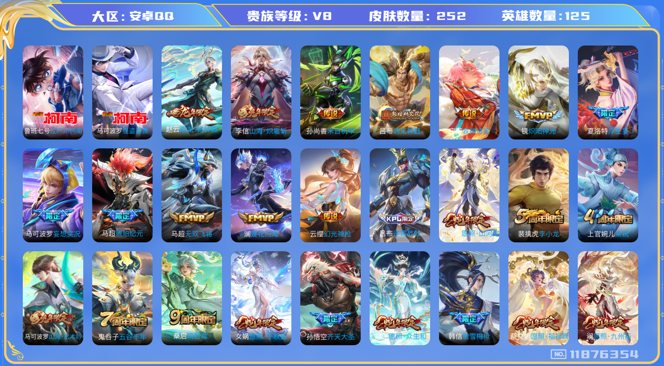 [11876354]V8 2珍品传说 21传说 125英雄 252皮肤 可修改实名 优质装备:江户川柯南,怪盗基德,炽阳神光,末日机甲-孙尚香(绿蚂蚱),无双飞将,山海·炽霜斩(李信年限),浮生妄,妄想实况,遇见神鼓,澜逐花归海,琥珀纪元马超,牧神诗旅,涂山容容 传说皮:乘龙·铭钟鼎(赵云年限),幻光神枪 珍宝阁皮:妄想食味,胡桃夹子 限定皮:愿照·九州拓(澜年限),愿照·福禄聚(蔡文姬年限),愿照·岁时盈(虞姬年限),愿照·山河定(司空震年限),愿照·众生和(妲己年限),愿照·千秋盛(女娲年限),逐霄战戟,鸣野蒿,傲雪梅枪,齐天大圣,五谷丰年,梁祝,李小龙,山海·玄木吟(马可年限) 史诗皮:器灵·浮梦炉,星界战将,谪仙醉月,龙之律动,石田雨龙,茶境仙,撼地雄心,破空之剑,涂山红红,东方月初,蒙犽顽岩魄,埋骨钱,琥珀纪元伽罗,超元猎域,百相守梦-百里守约,百相守梦-黄忠,紫霞仙子,黄金分割率,特工魅影,千年之狐,江河有灵,百解令(蒙犽),猫狗日记-孙策,节奏热浪,修罗,摇滚巨星,水果甜心,天才门将,星夜王子,心灵骇客,暗隐猎兽者,幽灵船长,鬼剑武藏,心灵战警,舞动绿茵,地狱岩魂,纤云弄巧,乘风破浪,逐浪之夏,月团寄思,水晶猎龙者,金属风暴,鹰眼统帅,无心,未来纪元-赵云,玫瑰异探