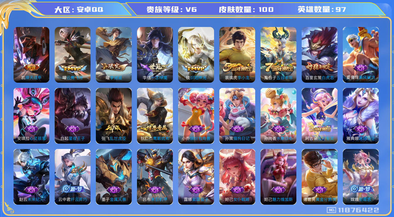 - [11548347]V6 1典藏 6传说 125英雄 184皮肤 可修改实名 女号 优质装备:九霄神辉(木兰典藏),黄金狮子座,炽阳神光,超时空战士-狄仁杰,涂山容容 珍宝阁皮:蔷薇恋人,玩趣恶龙 限定皮:愿照·九州拓(澜年限),愿照·山河定(司空震年限),逐霄战戟,鸣野蒿,五谷丰年,梁祝,孙行者,神器·万象笔,山海·玄木吟(马可年限) 史诗皮:器灵·浮梦炉,化蝶舞,星界战将,谪仙醉月,龙之律动,石田雨龙,茶境仙,破空之剑,琥珀纪元伽罗,蔬乡物语(鲁班七号),百相守梦-百里守约,紫霞仙子,永昼,江河有灵,魅语,百解令(蒙犽),白蛇,晚萤,电玩·爆裂旋风,末日机甲-吕布,乱世虎臣,修罗,女仆咖啡,摇滚巨星,水果甜心,星夜王子,心灵骇客,功夫厨神,暗隐猎兽者,幽灵船长,鬼剑武藏,暗渊魔法,心灵战警,乐园奇幻夜,纤云弄巧,拒霜思,缤纷独角兽,乘风破浪,逐浪之夏,水晶猎龙者,曙光守护者,金属风暴,原初追逐者,圣诞狂欢,鹰眼统帅,魅力维加斯,无心,未来纪元-赵云