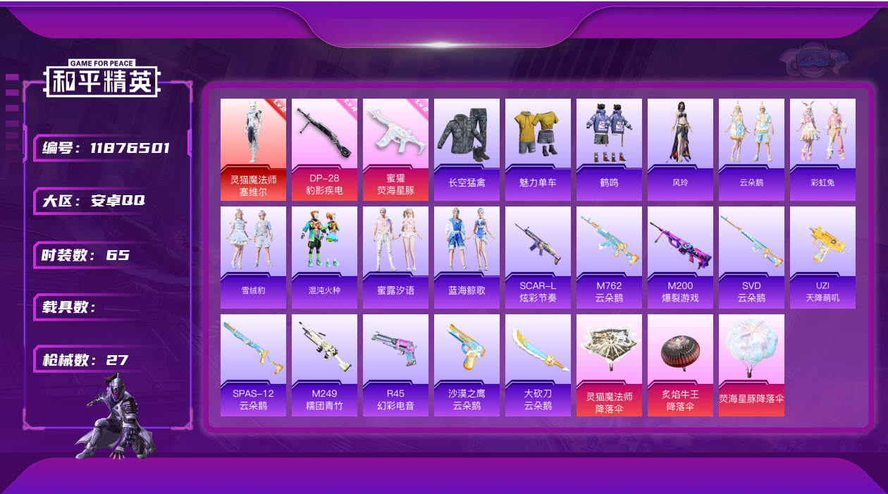 - PX_2111751-安卓QQ 205皮 贵族8级 1典藏 1珍品传说 8传说 65史诗【荣耀典藏】全息碎影【珍品传说】黑崎一护【传说皮肤】零号·赤焰,地狱火,挚爱之约,一念神魔,鸣野蒿,逐花归海,超时空战士,启明星使【史诗皮肤】赞萌露比,石田雨龙,百相守梦,魅语,心灵战警,箭羽风息,暗隐猎兽者,天才门将,绅士熊喵,鸭鸭历险记,德古拉伯爵,暗渊魔法,末日机甲,圣诞狂欢,龙骑士,金属风暴,乘风破浪,