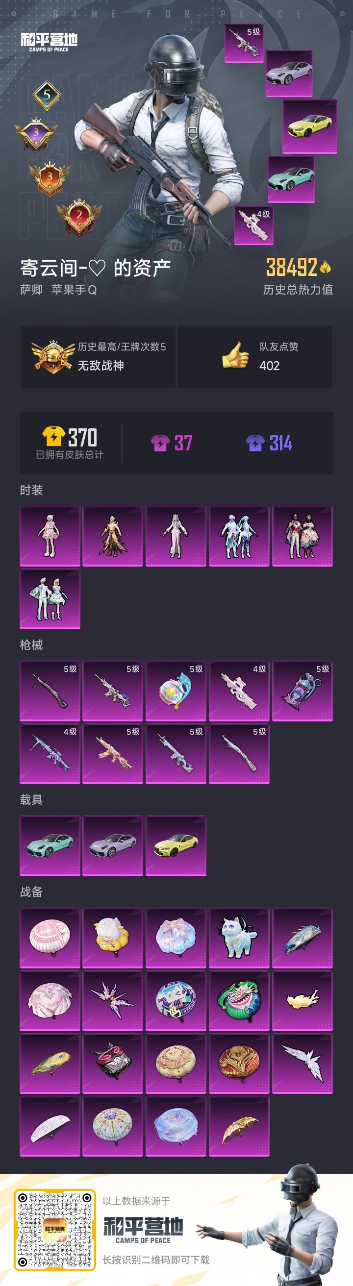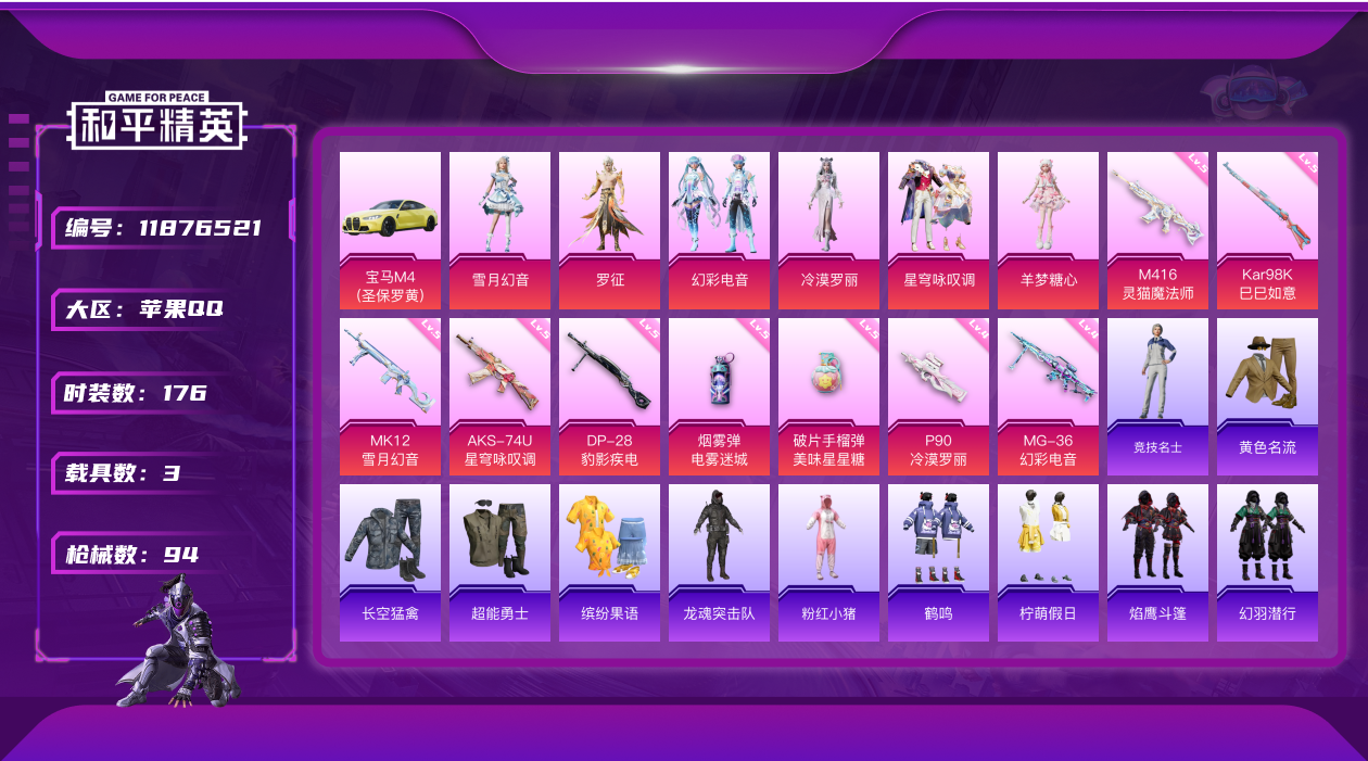 - PX_2062114-2 苹果手Q-11王牌印记-8粉装-5特效枪-0载具-53884热力值-133套装-172枪皮-0卓越印记-0传奇印记 【8粉装】,宝贝奶油派,恐龙拽拽,星云暗核,宙之时溯,海盐物语,炙焰红王,烈焰拳霸,幻影战神 【5特效枪】SCAR-L-青春物语-5级 M416-风花雪月-5级 M762-激战未来-5级 Kar98K-巳巳如意-3级 UMP45-恐龙拽拽-6级 【5稀有紫
