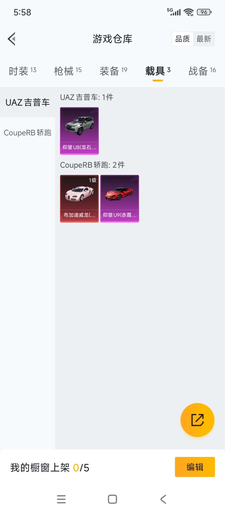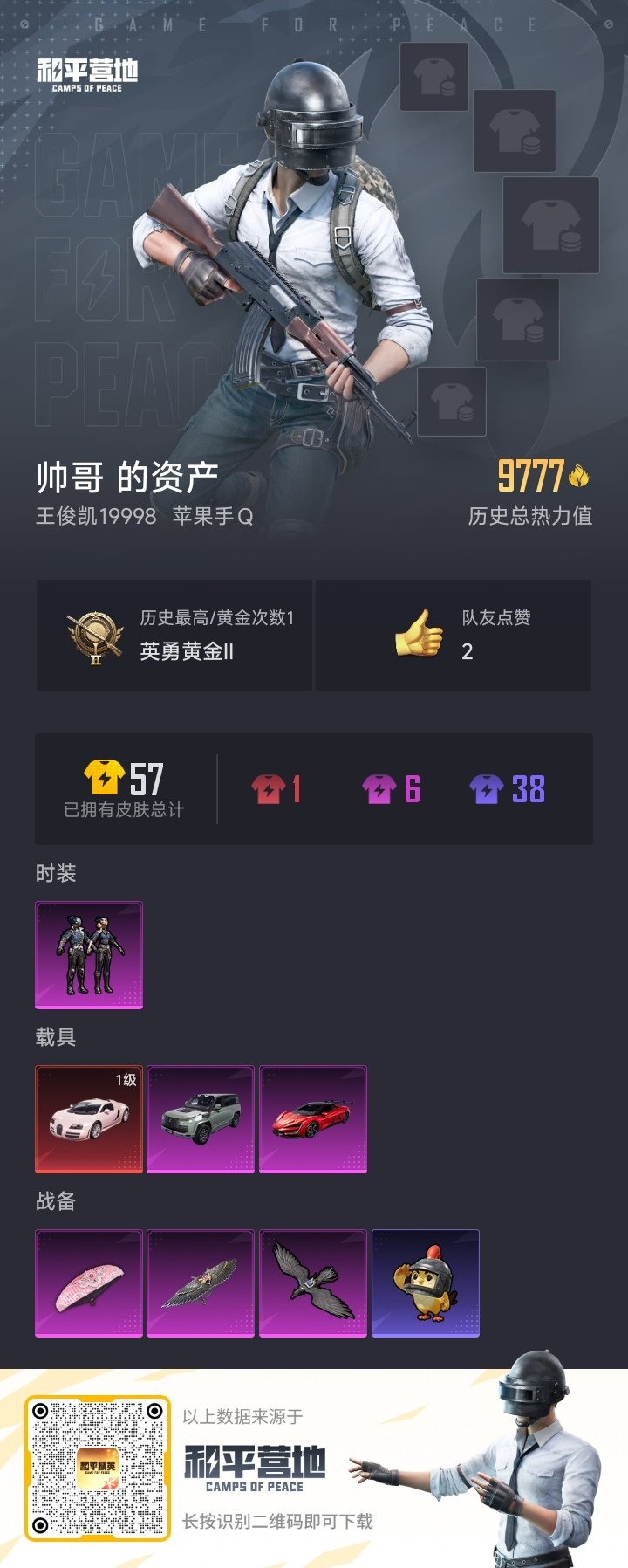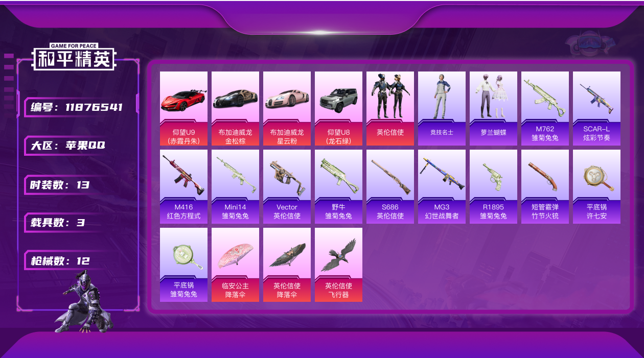 [11876541]1粉装 3载具 可二次 可修改实名 优质装备:布加迪威龙(金松棕),布加迪威龙(星云粉),仰望U8(龙石绿),仰望U9(赤霞丹朱),一级布加迪威龙(星云粉),英伦信使 紫色装扮:萝兰蝴蝶,竞技名士 优质战备:英伦信使降落伞,英伦信使飞行器,临安公主降落伞