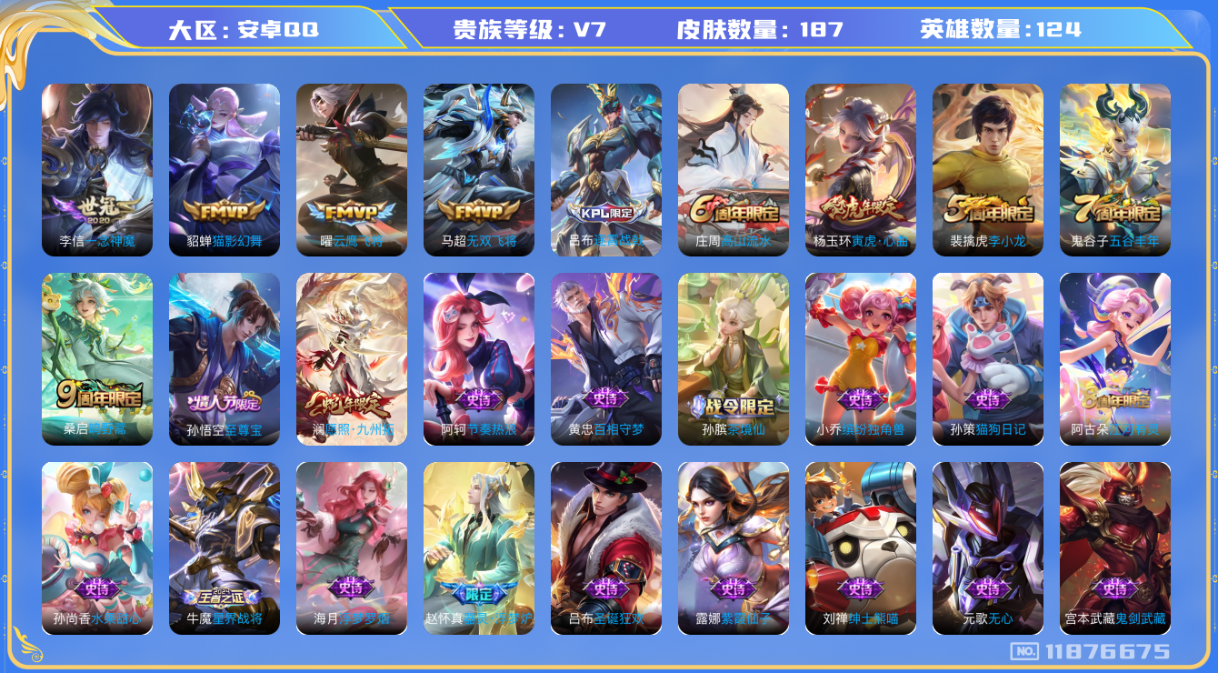[11876675]V7 6传说 124英雄 187皮肤 可修改实名 女号 优质装备:云鹰飞将(小将军),猫影幻舞,一念神魔,无双飞将 珍宝阁皮:蔷薇恋人,女武神 限定皮:愿照·九州拓(澜年限),逐霄战戟,鸣野蒿,至尊宝,高山流水,五谷丰年,李小龙,寅虎·心曲(虎婆) 史诗皮:器灵·浮梦炉,星界战将,茶境仙,超元猎域,百相守梦-黄忠,紫霞仙子,特工魅影,千年之狐,江河有灵,浮梦罗烟,蒙恬荣光圣徽,偶像歌手,晚萤,龙骑士(小龙虾),猫狗日记-孙策,节奏热浪,修罗,女仆咖啡,摇滚巨星,水果甜心,绅士熊喵,星夜王子,暗隐猎兽者,鬼剑武藏,心灵战警,缤纷独角兽,逐浪之夏,水晶猎龙者,金属风暴,原初追逐者,圣诞狂欢,鹰眼统帅,暗夜贵公子,魅力维加斯,赏金猎手,无心