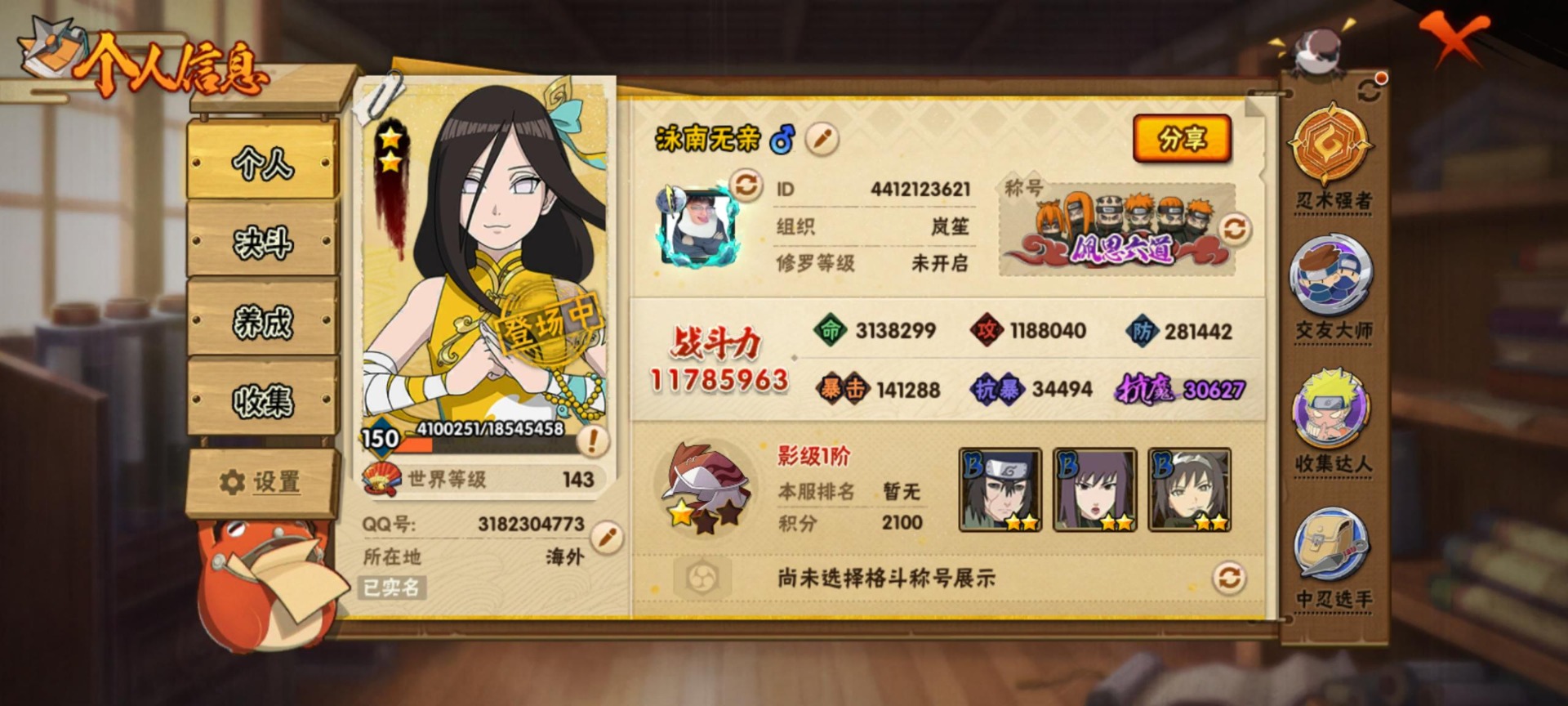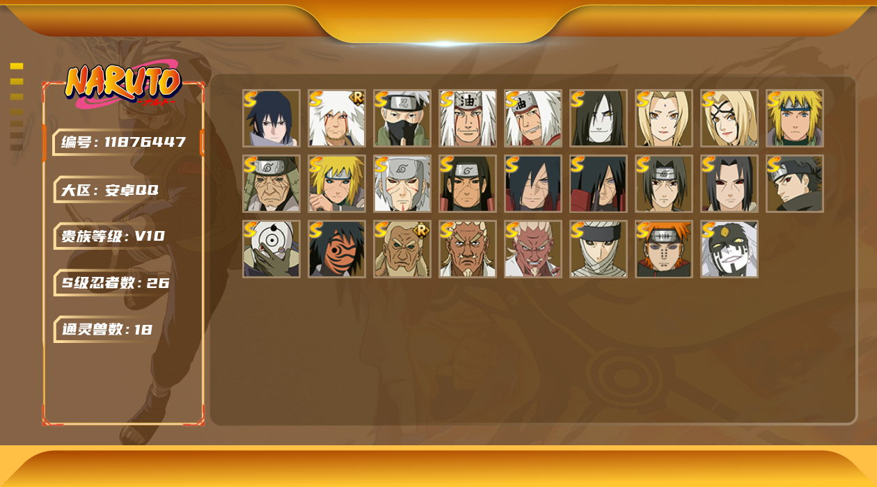 [11876447]V10 26S忍 37A忍 18通灵 1178.5W战力 可二次 可修改实名 优质装备:千手柱间「秽土转生」,宇智波鼬「秽土转生」,宇智波斑「秽土转生」,艾「三代目雷影」,千手扉间「秽土转生」,纲手「百豪」,无「二代目土影」,波风水门「秽土转生」,猿飞日斩「秽土转生」,艾「四代目雷影」,“宇智波斑” 「白面具」,神秘面具男 「红夜之刃」,宇智波佐助「永恒万花筒」,宇智波斑「秽土转生·解」,大筒木桃式,艾「忍界大战」,宇智波止水「须佐能乎」,旗木卡卡西「须佐能乎」,自来也 「传说中的三忍」 S级忍者:自来也 「舞之豪杰」,宇智波鼬 「须佐能乎」,佩恩「天道」,波风水门,大蛇丸,自来也,纲手