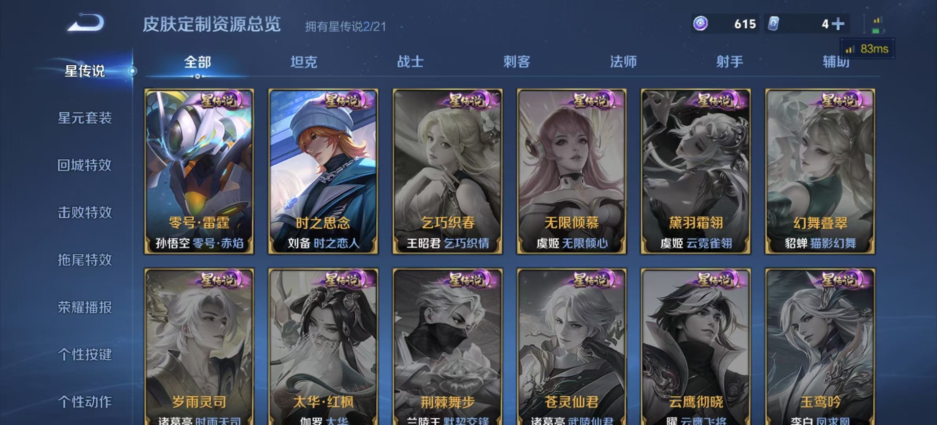 伽罗天狼溯光者,孙膑天狼运算者,典韦岱宗,鲁班七号乒乒小将,吕布御风骁将,后羿如梦令,杨玉环寅虎·心曲,裴擒虎李小龙,上官婉儿梁祝,马可波罗逐梦之星,桑启鸣野蒿,孙悟空孙行者,孙悟空大圣娶亲,孙悟空至尊宝,百里玄策白虎志,马超神威,韩信傲雪梅枪,韩信飞衡,百里守约朱雀志,嫦娥如梦令,关羽冰锋战神