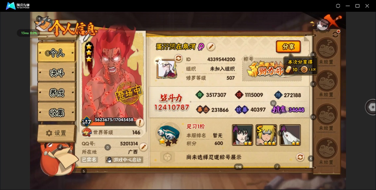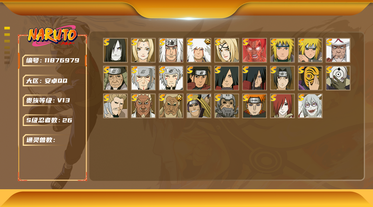 [11876979]V13 26S忍 40A忍 1241W战力 可二次 可修改实名 S级忍者:迈特凯「死门」,自来也 「舞之豪杰」,药师兜「仙人模式」,宇智波斑「秽土转生」,艾「三代目雷影」,“宇智波斑” 「白面具」,半藏「秽土转生」,千手扉间「秽土转生」,纲手「百豪」,波风水门「秽土转生」,金角/银角「秽土转生」,猿飞日斩「秽土转生」,长门「秽土转生」,鬼灯幻月「二代目水影」,宇智波斑,千手柱间,艾「四代目雷影」,千手扉间,神秘面具男,宇智波鼬 「须佐能乎」,佩恩「天道」,猿飞日斩,波风水门,大蛇丸,自来也,纲手