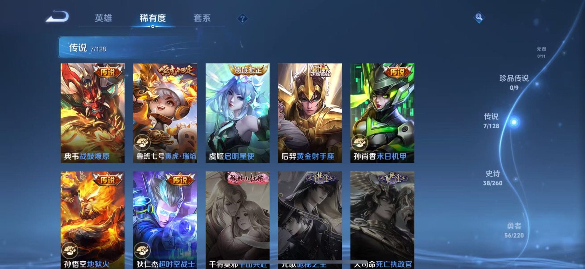 - PX_2094466-37 安卓QQ/绝世王者/271皮肤/125英雄/0典藏/0珍品无双/0无双/1珍品传说/14传说/78史诗/9稀有英雄 【1 珍品传说】怪盗基德 马可波罗, 【14 传说皮肤】启明星使 虞姬,碎云 百里守约,地狱火 孙悟空,仲夏夜之梦 貂蝉,落雪白狼 亚连,时雨天司 诸葛亮,黄金射手座 后羿,乘龙·问璇玑 孙尚香,一念神魔 李信,淬星耀世 赵云,超时空战士 狄仁杰,冠军飞将