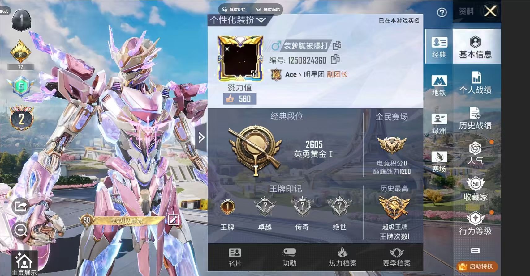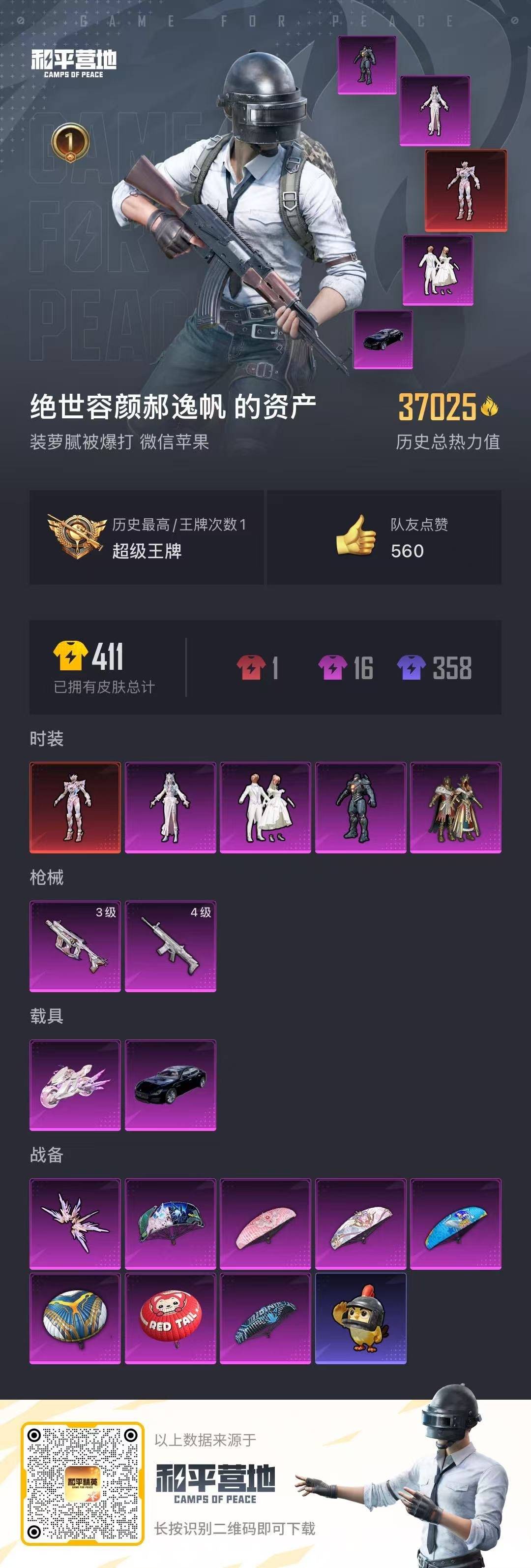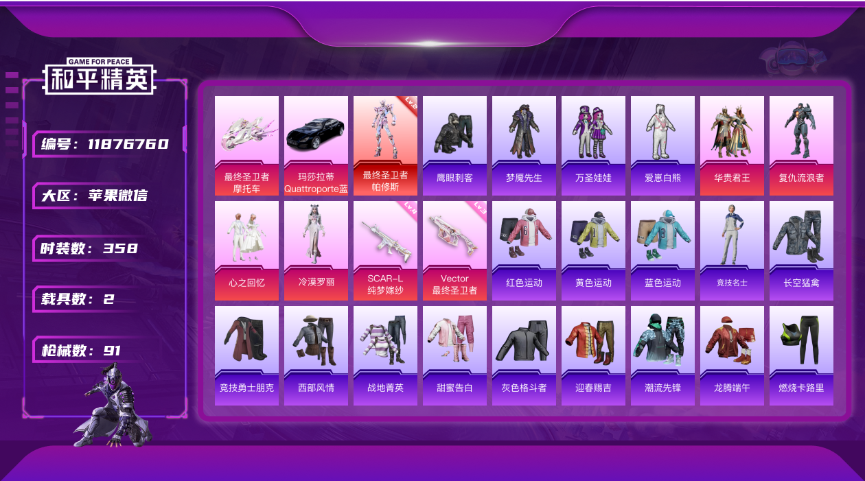 - PX_2095602- 安卓手Q-10王牌印记-10粉装-3特效枪-3载具-85604热力值-224套装-258枪皮-1卓越印记-0传奇印记 【10粉装】,雪国幻梦,梦幻火箭,2号机款机体服,宝贝奶油派,天使彩虹糖,花间之火,暗夜玫瑰,复仇流浪者,桀骜红莲,香水柠檬 【3特效枪】AKM-梦之光华-6级 M416-心之恋语-7级 Kar98K-巳巳如意-1级 【7稀有紫装】,浪漫天命,雪山精英,明