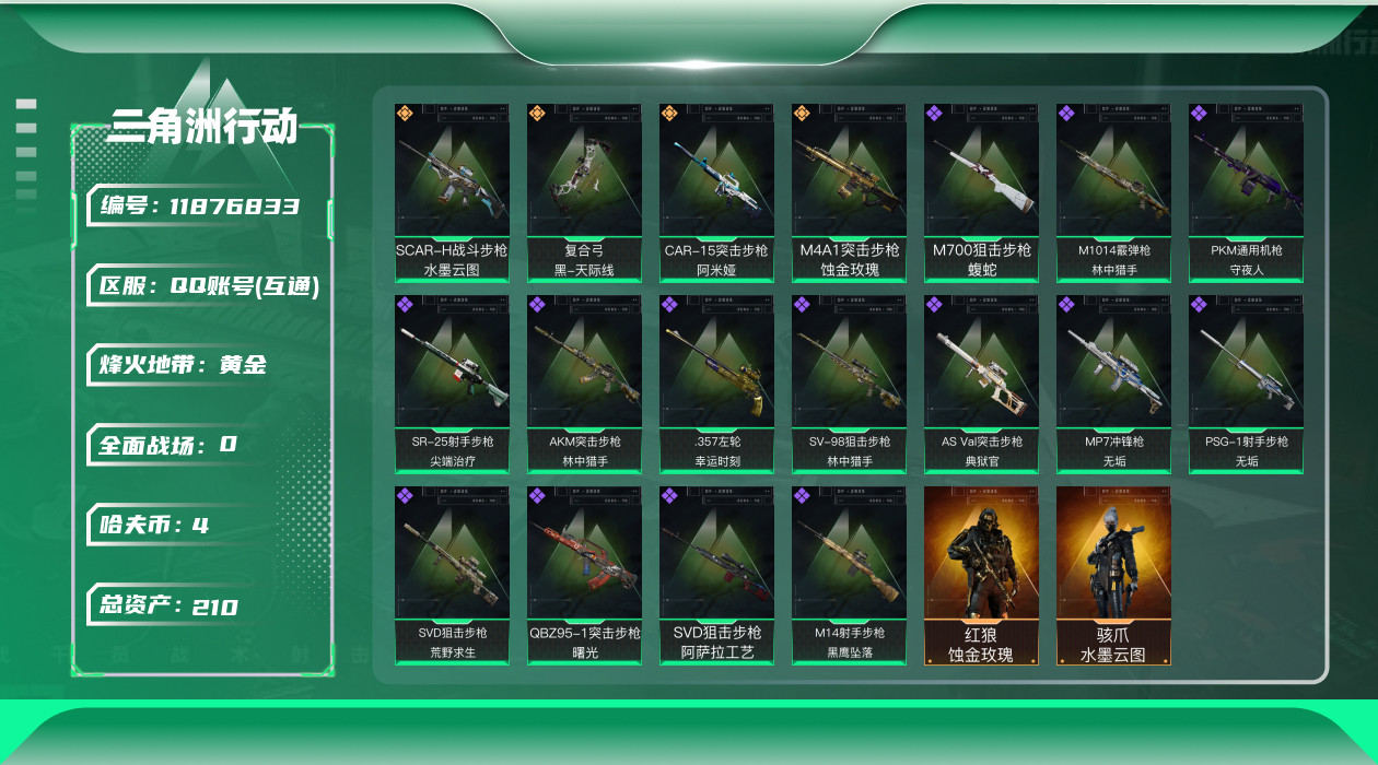 [11876833]总资产:210.3M 2干员外观 4传说枪械 哈夫币:4.004K 可二次 可修改实名 烽火地带段位:黄金 全面战场段位:列兵 传说武器皮肤:SCAR-H战斗步枪-水墨云图,复合弓-黑-天际线,CAR-15突击步枪-阿米娅,M4A1突击步枪-蚀金玫瑰 史诗武器皮肤:M700狙击步枪-蝮蛇,M1014霰弹枪-林中猎手,PKM通用机枪-守夜人,SR-25射手步枪-尖端治疗,AKM突击步枪-林中猎手,.357左轮-幸运时刻,SV-98狙击步枪-林中猎手,AS Val突击步枪-典狱官,MP7冲锋枪-无垢,PSG-1射手步枪-无垢,SVD狙击步枪-荒野求生,QBZ95-1突击步枪-曙光,SVD狙击步枪-阿萨拉工艺,M14射手步枪-黑鹰坠落 干员外观:红狼-蚀金玫瑰,骇爪-水墨云图