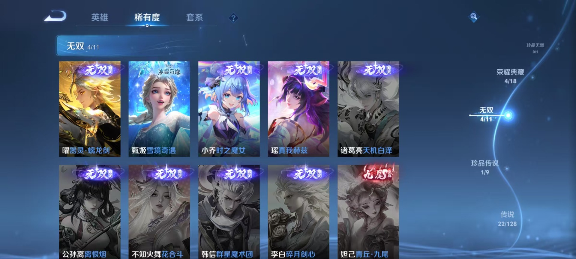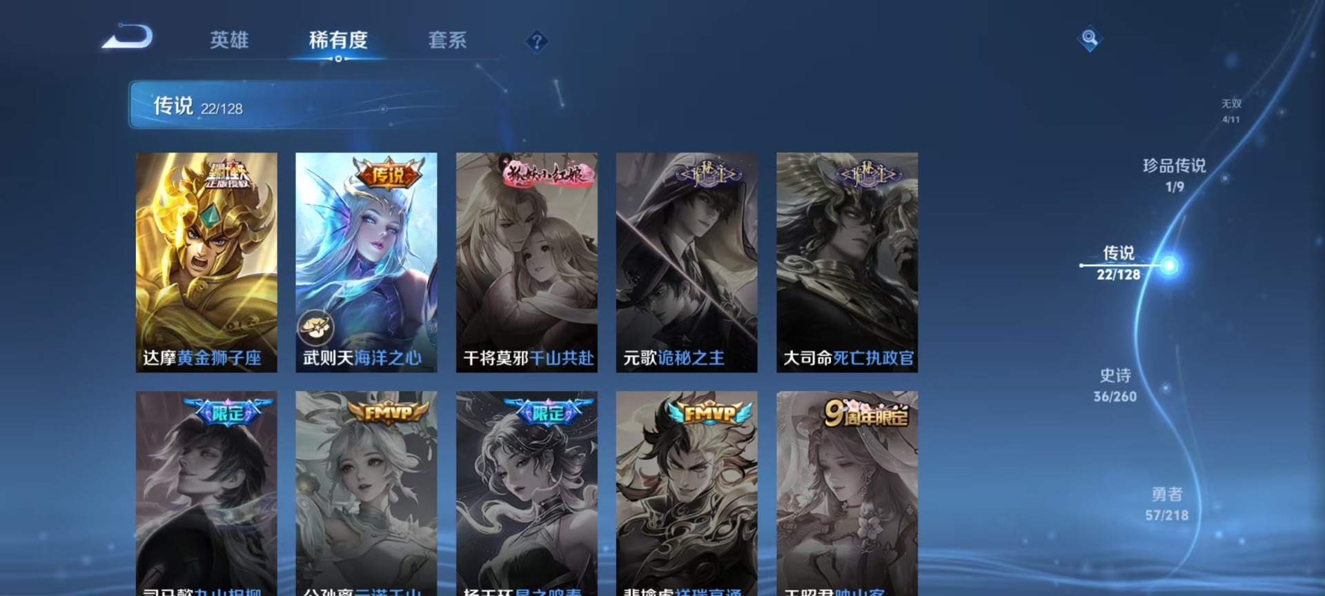 - PX_2109843-Q/最强王者/95皮肤/116英雄/0典藏/0珍品无双/0无双/0珍品传说/4传说/18史诗/7稀有英雄 【4 传说皮肤】炽阳神光 镜,愿照·九州拓 澜,幻光神枪 云缨,鸣野蒿 桑启, 【18 史诗皮肤】无心 元歌,星夜王子 白起,摇滚巨星 嬴政,魅力维加斯 妲己,鹰眼统帅 狄仁杰,傲雪梅枪 韩信,逐浪之夏 李元芳,皇家上将 赵云,圣诞狂欢 吕布,器灵·浮梦炉 赵怀真,地狱岩