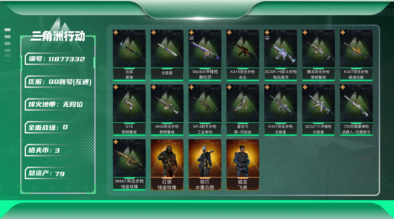 [11877332]总资产:79M 3干员外观 2近战传说 15传说枪械 哈夫币:3.451K 可二次 可修改实名 优质装备:近战-黑海,近战-北极星,K416突击步枪-命运(典藏),Vector冲锋枪-美杜莎,SCAR-H战斗步枪-电玩高手 烽火地带段位:无段位 全面战场段位:无段位 传说武器皮肤:腾龙突击步枪-黎明警戒,K437突击步枪-极速狂飙,G18-黎明警戒,AKM突击步枪-黎明警戒,M14射手步枪-工业审判,复合弓-黑-天际线,K437突击步枪-北极星,QCQ171冲锋枪-北极星,725双管霰弹枪-送葬人-无题密令,M4A1突击步枪-蚀金玫瑰 干员外观:红狼-蚀金玫瑰,骇爪-水墨云图,威龙-飞虎