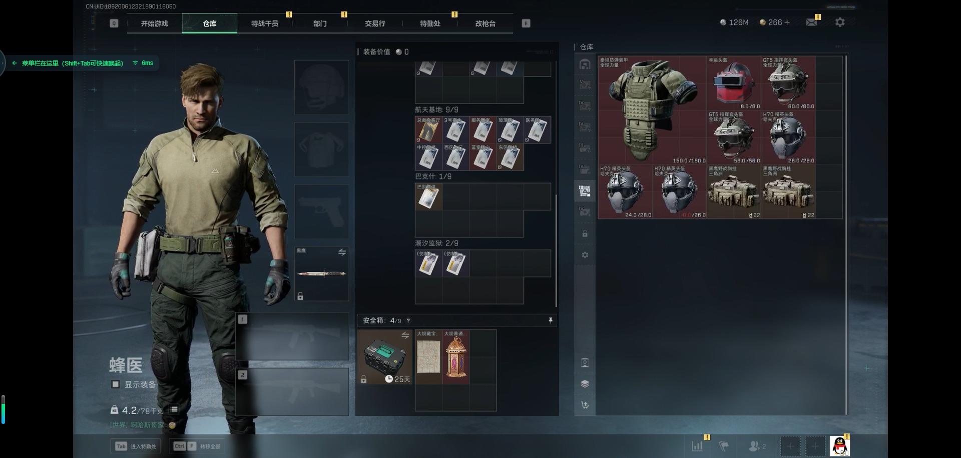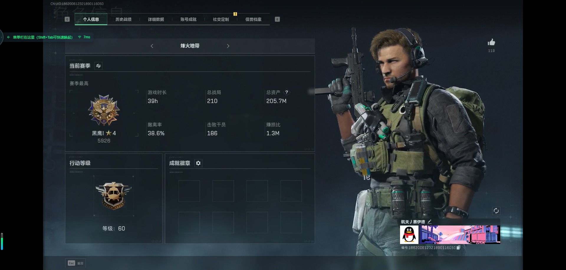 [11877340]总资产:205.7M 2干员外观 5传说枪械 哈夫币:126K 顶级安全箱(9.17到期) 可二次 可修改实名 优质装备:顶级安全箱(3x3),非洲之心 烽火地带段位:黑鹰 全面战场段位:上等兵 传说武器皮肤:AK-12突击步枪-夜鹰,SMG45冲锋枪-骑士,复合弓-黑-天际线,勇士冲锋枪-能天使-午夜邮差,CAR-15突击步枪-黑鹰坠落 史诗武器皮肤:PKM通用机枪-蝮蛇,G3战斗步枪-战场英杰,SR-25射手步枪-尖端治疗,AS Val突击步枪-尖端治疗,SG552突击步枪-尖端治疗,Ash-12战斗步枪-守夜人,MP5冲锋枪-深海恐惧,勇士冲锋枪-深海恐惧,AKM突击步枪-林中猎手,.357左轮-幸运时刻,SVD狙击步枪-暗夜猎手,M16A4突击步枪-竞赛选手,PKM通用机枪-守夜人,M1014霰弹枪-林中猎手,SV-98狙击步枪-林中猎手,M250通用机枪-囚徒,SV-98狙击步枪-囚徒,QBZ95-1突击步枪-曙光,Vector冲锋枪-阿萨拉文明,SVD狙击步枪-阿萨拉工艺,S12K霰弹枪-曙光,PKM通用机枪-英雄,M700狙击步枪-竞技风 干员外观:无名-夜鹰,露娜-黑·天际线