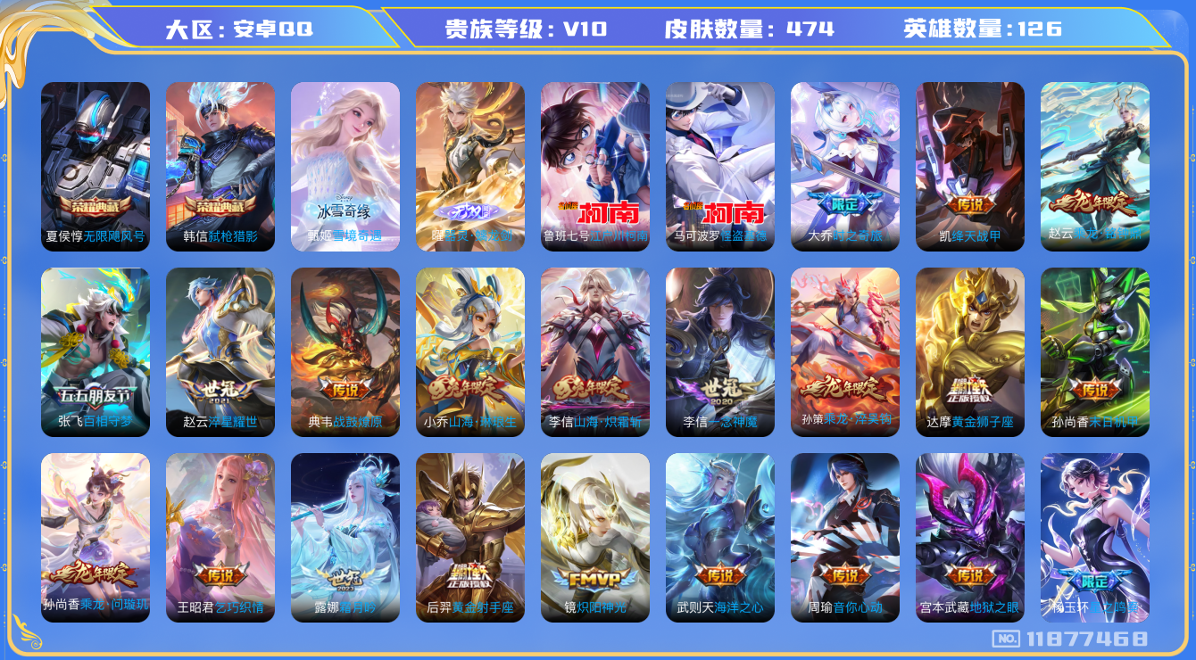 [11877468]V10 2典藏 2无双 2珍品传说 64传说 126英雄 474皮肤 典藏英雄武则天 可修改实名 优质装备:无限飓风号(高达),弑枪猎影(韩信典藏),雪境奇遇,雪境奇遇-甄姬,器灵·螭龙剑,江户川柯南,怪盗基德,黄金狮子座,黄金射手座,绛天战甲(鸡嘴战神),黄金白羊座,猫影幻舞,炽阳神光,一念神魔,云霓雀翎,末日机甲-孙尚香(绿蚂蚱),地狱火,零号·赤焰,海洋之心,地狱之眼,飞鸢探春,音你心动-周瑜,胖达荣荣,乞巧织情,游龙清影(小青龙),淬星耀世,超时空战士-狄仁杰,碎云,山海·炽霜斩(李信年限),山海·琳琅生(小乔年限),山海·苍雷引(电光曜子),浮生妄,百相守梦(张飞),大乔-时之奇旅,夜礼服假面,霜月吟,澜逐花归海,艾琳觅芳踪,云中君群星魔术团,玄雷天君 传说皮:乘龙·问璇玑(孙尚香年限),乘龙·铭钟鼎(赵云年限),乘龙·淬吴钩(孙策年限),典韦战鼓燎原,落雪白狼,星之鸣奏,祥瑞亨通,幻光神枪 珍宝阁皮:妄想食味,优雅恋人,蔷薇恋人 限定皮:愿照·九州拓(澜年限),愿照·福禄聚(蔡文姬年限),愿照·岁时盈(虞姬年限),愿照·山河定(司空震年限),愿照·众生和(妲己年限),愿照·千秋盛(女娲年限),映山客,鸣野蒿,至尊宝,凤求凰(白切鸡),太华(伽罗年限),异界灵契(白毛香),补天,寅虎·展翼(孙膑年限),绯月行,时之彼端,魔法小厨娘,白晶晶,时雨天司(水龙头),神威(电光马子),飞衡(韩信年限),玄嵩(庄周年限),山海·碧波行(瑶年限),瑞麟志(木兰年限),至美·化雀舞,影龙天霄,遇见飞天,高山流水,五谷丰年,冰锋战神,武圣,天狼运算者,游园惊梦,烈魂,虎魄,天狼征服者,天狼绘梦者,李小龙,逐梦之光,辉光之辰,如梦令-后羿,孙行者,猪悟能,天魔缭乱,冰霜恋舞曲,热情桑巴,女儿国国王,寅虎·御盾(廉颇年限),寅虎·瑞焰(虎皮蛋子),寅虎·心曲(虎婆),寅虎·赤拳(老虎年限),时之祈愿-云中君,时之祈愿-瑶(瑶传限),玉兔公主,唐三藏,枫霜尽,匿光启智者,梦圆繁星,山海·玄木吟(马可年限) 史诗皮:鸭鸭历险记-刘禅,苍鳞隐世,器灵·浮梦炉,狼魂孤将,星界战将,龙之律动,石田雨龙,百相守梦-周瑜,茶境仙,海诺心动手记,芈月浮光幕影,决胜骁骑,上官婉儿群星魔术团,蔬乡物语(鲁班七号),乘龙·聚宝船(安琪拉年限),乘龙·忆丹青(大乔年限),琥珀纪元伽罗,百相守