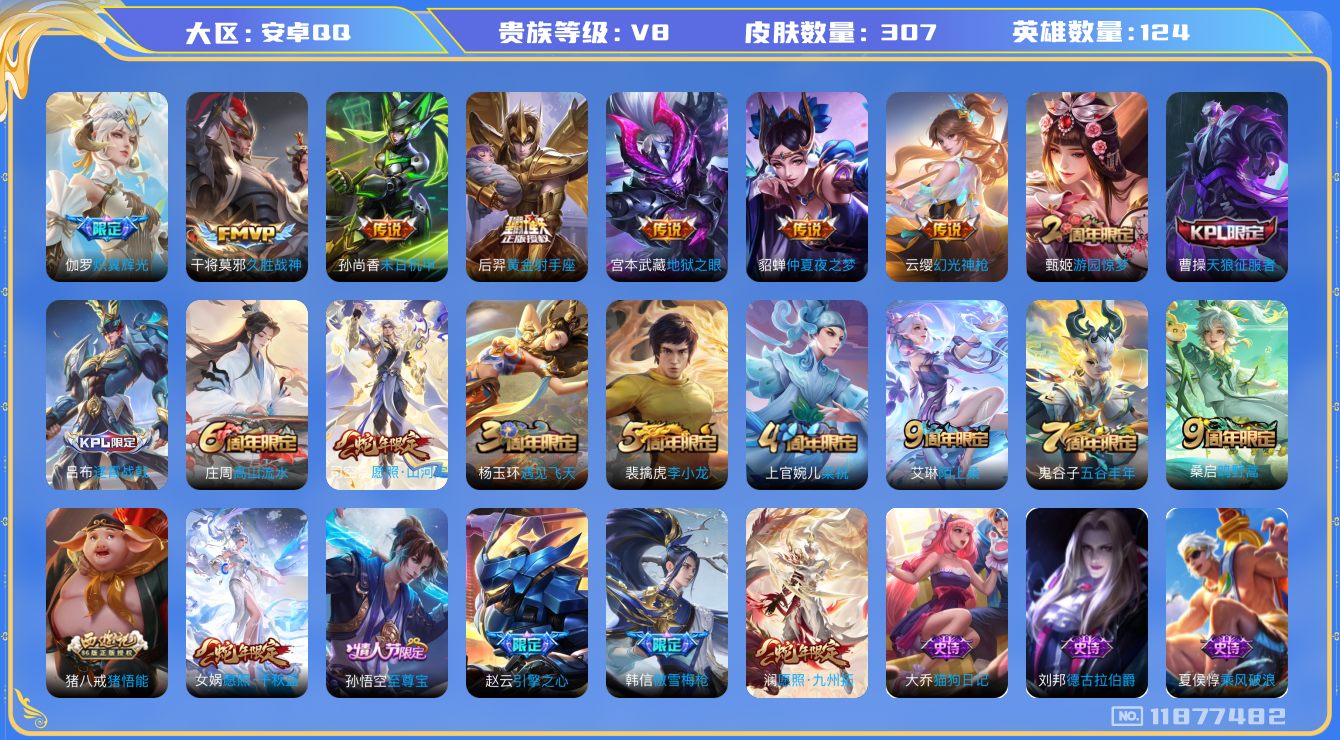 [11877482]V8 12传说 124英雄 307皮肤 可修改实名 优质装备:黄金射手座,久胜战神,末日机甲-孙尚香(绿蚂蚱),仲夏夜之梦(大飞蛾),地狱之眼,炽翼辉光(娃娃菜牛角包) 传说皮:幻光神枪 珍宝阁皮:蔷薇恋人,女武神 限定皮:愿照·九州拓(澜年限),愿照·山河定(司空震年限),愿照·千秋盛(女娲年限),逐霄战戟,陌上桑,鸣野蒿,至尊宝,傲雪梅枪,遇见飞天,高山流水,五谷丰年,游园惊梦,梁祝,天狼征服者,李小龙,猪悟能,引擎之心 史诗皮:器灵·浮梦炉,化蝶舞,谪仙醉月,雪豹·霜爪,茶境仙,破空之剑,战舞者,百相守梦-百里守约,紫霞仙子,苍穹之光,电玩小子(小书包),白龙吟,黄金分割率,千年之狐,蒙恬荣光圣徽,冰冠公主,青蛇,偶像歌手,电玩·爆裂旋风,暗夜猫娘,龙骑士(小龙虾),末日机甲-吕布,猫狗日记-孙策,猫狗日记-大乔,乱世虎臣,女仆咖啡,摇滚巨星,水果甜心,天才门将,星夜王子,心灵骇客,功夫厨神,德古拉伯爵,暗隐猎兽者,鬼剑武藏,心灵战警,乐园奇幻夜,天秀·启明,地狱岩魂,繁星吟游(呼啦呼啦),乘风破浪,逐浪之夏,月团寄思,水晶猎龙者,曙光守护者,箭羽风息,金属风暴,原初追逐者,圣诞恋歌,鹰眼统帅,魅力维加斯,黎明之约,无心,未来纪元-赵云