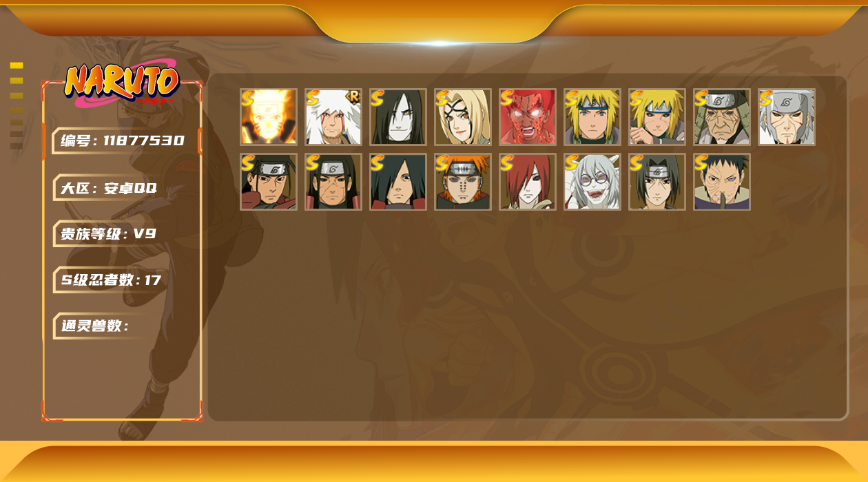 [11877530]V9 17S忍 32A忍 902W战力 可二次 可修改实名 S级忍者:漩涡鸣人 「九喇嘛连结」,迈特凯「死门」,宇智波带土 「忍界大战」,千手柱间「秽土转生」,自来也 「舞之豪杰」,药师兜「仙人模式」,千手扉间「秽土转生」,纲手「百豪」,波风水门「秽土转生」,猿飞日斩「秽土转生」,长门「秽土转生」,宇智波斑,千手柱间,宇智波鼬 「须佐能乎」,佩恩「天道」,波风水门,大蛇丸